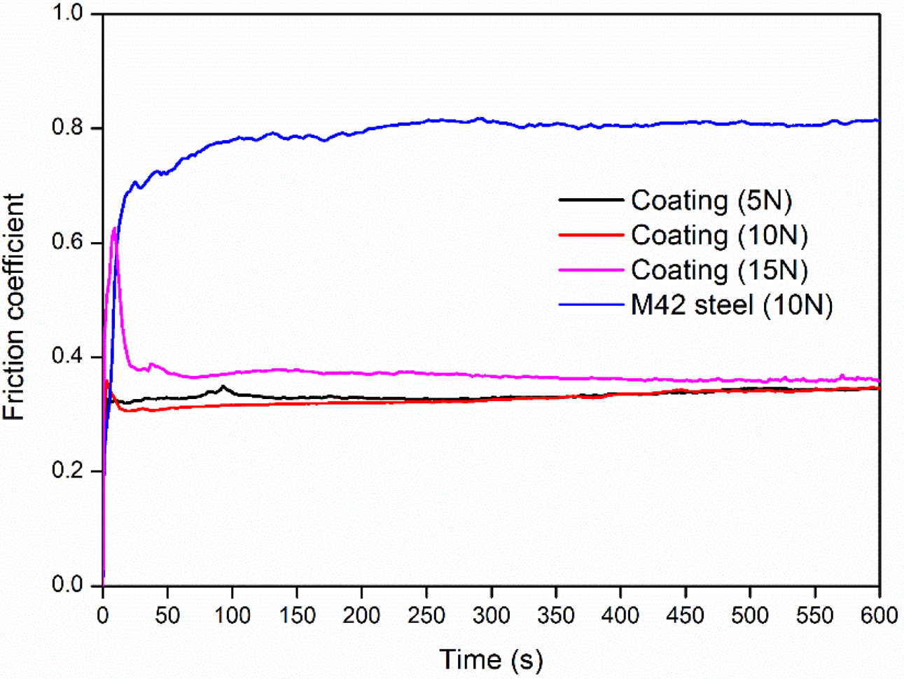 Fig. 4 Sliding friction coefficients of WC-10Co-4Cr coatings at different loads, compared with that of uncoated M42 steel. |