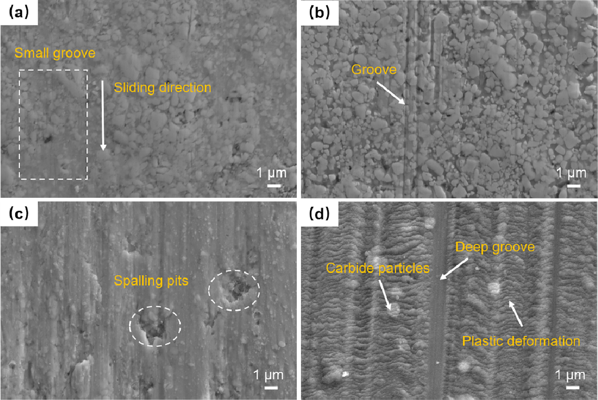 SEM micrographs of worn-out surface for WC-10Co-4Cr coatings under the dry sliding condition at a load of 5 N, 10 N and 15 N are shown in Fig. 5(a-c). The wear tracks of the coatings are smooth, and only few shallow and narrow grooves exist, which are parallel to the direction of sliding. The spalling pits marked in red color in Fig. 5(c) represent a small amount of WC particles pull-outs. The characteristics of worn-out surface of coatings indicate that the main wear mechanism is micro-cutting wear. For comparation, the worn surface of M42 steel subjected to dry sliding wear on applying a load of 10 N load is depicted in Fig. 5(d). The typical plastic deformation morphologies on the uncoated worn surface are observed. This phenomenon causes the materials removed from worn surface directly, sub- sequently forming a hump or skirt shape [50]. The above features suggest that the dominated wear mechanisms of uncoated M42 steel are influenced by severe micro-cutting wear and plastic deformation wear, which consequently enhance the friction coefficient.