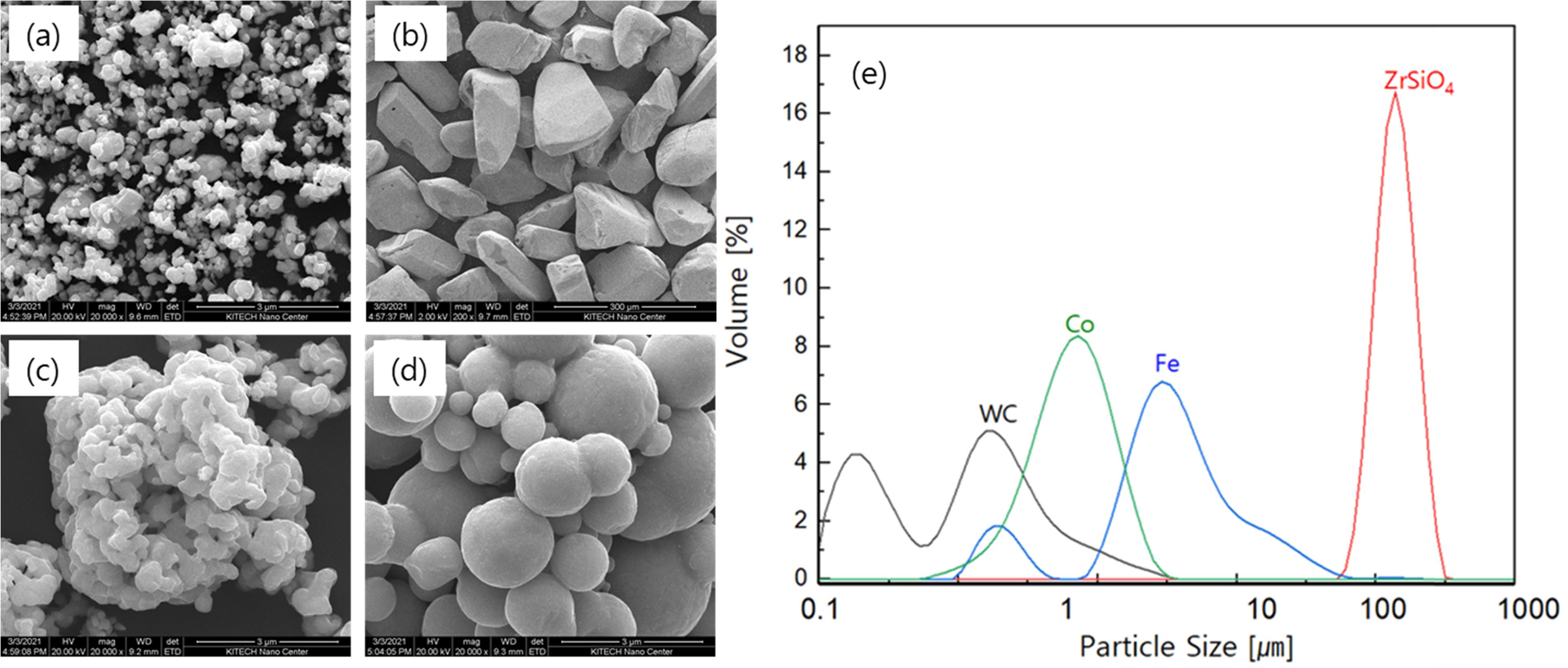 Tungsten carbide (W: 64.22 vol% and C: 35.78 vol%, ≤ 0.5 μm, TaeguTec Ltd.), cobalt (Co ≤ 2.0 μm, Alpha Ltd.), iron (Fe ≤ 10.0 μm, Alpha Ltd.), and zircon sand (ZrO2: 50.36 vol%, SiO2: 46.71 vol%, other oxides: 2.92 vol%) powders were used as the raw materials. Fig. 1 shows the micro-morphology of the starting powders by FE-SEM. The WC (see Fig. 1(a)) exhibits an angular shape, whereas Co (see Fig. 1(c)) and Fe (see Fig. 1(d)) are irregular circular types. On the other hand, ZrSiO4 (see Fig. 1(b)) has a three-dimensional columnar structure. These powders were mixed to the desired compositions, except for binderless WC, as follows: (i) WCZ-1: WC-13.15 vol% ZrSiO4, (ii) WCZ-2: WC-24.22 vol% ZrSiO4, (iii) WCoZ: WC-6.59 vol% Co-12.87 vol% ZrSiO4, (iv) WFeZ: WC-7.46 vol% Fe-12.75 vol% ZrSiO4. For reference, it is a vol% value obtained by converting the alloy composition commonly used in commercial WC-Co and WC-Fe hard materials, i.e (i) WC-5ZrSiO4 (wt.%), WC-10ZrSiO4 (wt.%), (iii) WC-5Co-5ZrSiO4 (wt.%), and (iv) WC-5Fe-5ZrSiO4 (wt.%). In order to further improve the refinement, the particles were mechanically milled by a planetary ball mill (pulverisette 5, FRITSCH Ltd.) with stainless steel vials and balls under the ratio of ball to powder of 15:1. The milling time was 12 h at 350 RPM, during which no contamination was detected in the Fe or Cr. Also, their mean particle size was measured by laser diffraction (Malvern-masterizer 2000) using Mie theory [33]. Referring to Fig.1-(e), the distribution of particle size is provided based on an average particle diameter of D (0.5), we can see the results for WC (0.48 μm), Co (1.83 μm), Fe (6.11 μm), and ZrSiO4 (128.36 μm).