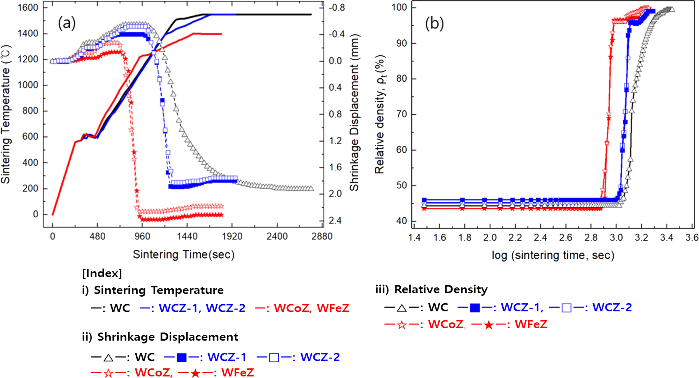 Fig. 2(a) shows the relation between sintering tem- perature and shrinkage displacement by sintering time. Depending on the constituents of the composites, there were different consolidation (or densification) profiles shown under applied temperature and pressure. It was shown that shrinkage behavior depended on the phase constituent of the binder and additive, which tended to persist up to their shrinkage saturated. The reason why the shrinkage initiation temperature differs with the presence of metallic binder phases (i.e., Co and Fe) during the solid-state diffusion could be caused by re-precipitation or rearrangement at the grain boundaries while starting to wet into the semi-liquid state while having a relatively low melting point. It is believed that the presence of binders with excellent solubility (see at 1523 K, Co: ~22 at% and Fe: ~7 at%) in WC means composites can reach the rapid densification stage at a relatively lower sintering temperature (at 1673 K) (see WC-5C-5Z: 1053 K and WC-5F-5Z: 1093 K), this is expected to come with an increase in shrinkage. In other words, the initial shrinkage characteristics are mainly determined by the wettability of the binder, where larger shrinkage rates imply superior wetting properties [37].