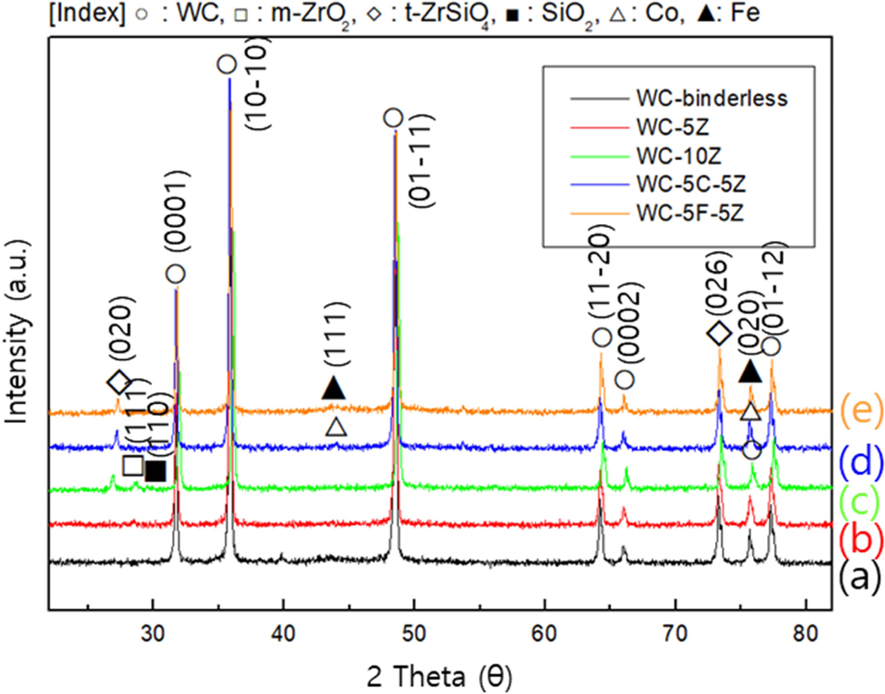 Moreover, the relative peak intensity ratio [I(0001)/I(10-10)] was considered to estimate the highly oriented growth of WC grains, i.e. (10-10): prism plane and (0001): basal plane. The increase of I(0001) could lead to the abnormal preferential growth in WC grains by the adjacent to the interface of zircon-rich phase, which values (I) and average grain size were calculated to (a) 0.33 (52.70 nm), (b) 0.60 (70.79 nm), (c) 0.67 (76.36 nm), (d) 0.47 (68.46 nm), and (e) 0.52 (62.84 nm). In other words, the refined WC grains could be grown very rapidly in the basal plane, where thermodynamic instability for thermal decomposition of zircon promotes non-uniform distribution of secondary phases. Another reason could be caused by high anisotropy interfacial energy in the solidification process of the metallic binder.