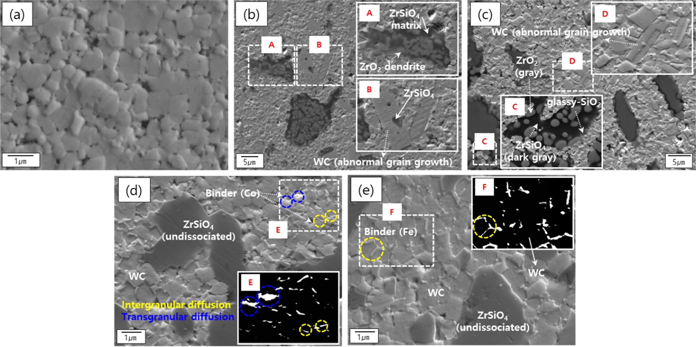 Fig. 3 shows the structural evolution of the WC-X-Y composites. Fig. 3(a) shows all the XRD peaks from WC, whereas Fig. 3(b) and (c) shows a tendency for dissociation (this takes place theoretically at 1949 K) from ZrSiO4 to ZrO2 and SiO2 because of the applied sintering temperature (occurring at 1823 K in this work). As reported by C. Curtis et al. [37], this thermal decom- position reaction begins to accelerate as temperatures rise from 1829 K, rapid cooling (and no subsequent annealing) after sintering resulted in significant residual zircon (t-ZrSiO4) without complete phase dissociation to zirconia (m-ZrO2) and silicon oxide (glassy). However, with added metallic binders, this dissociation did not occur in Fig. 3(d) and (e) when sintering was terminated at 1673 K.