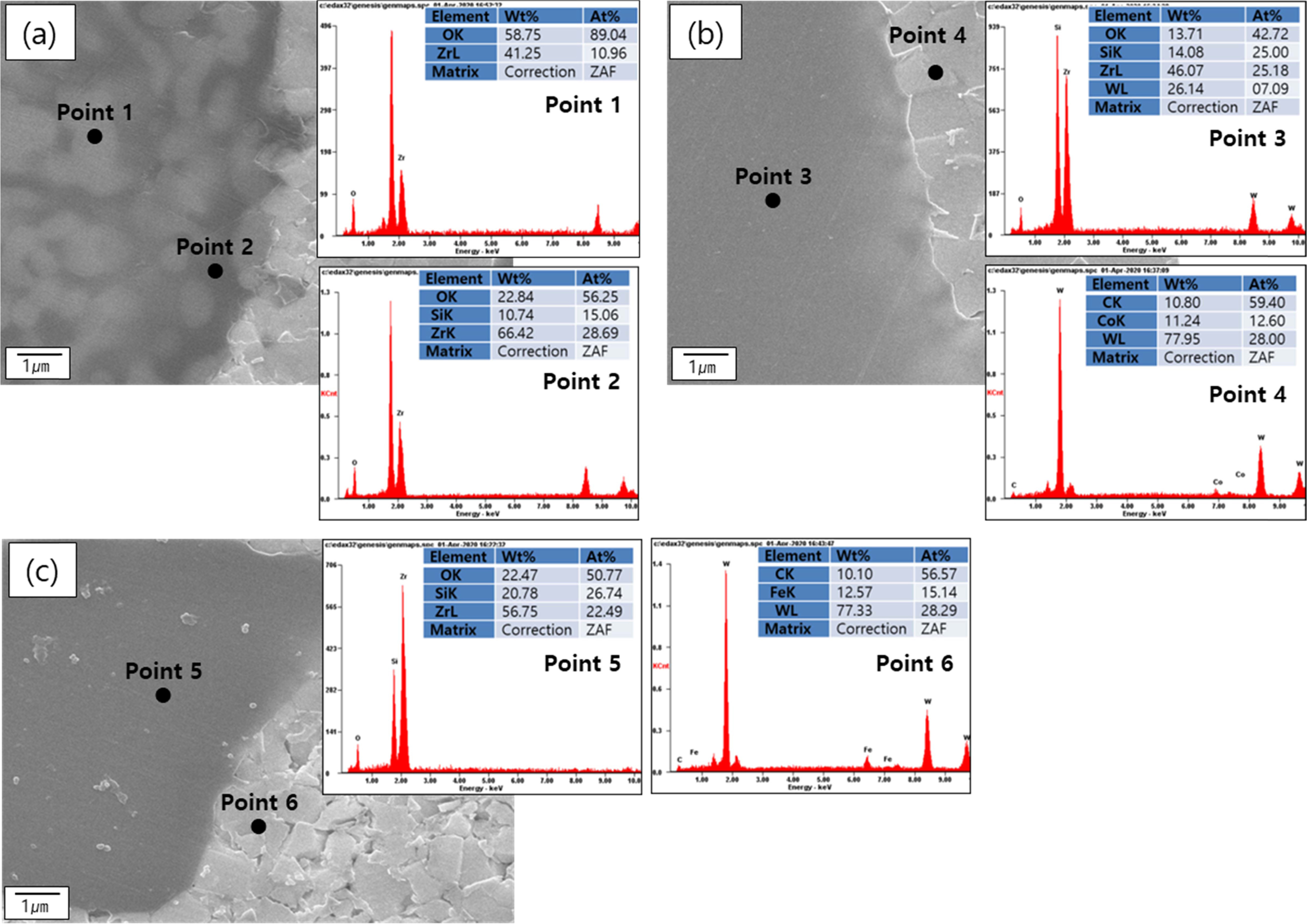 Fig. 5 indicates the variation of micro-strain measured using XRD indexing and Eq. (1). In particular, the highest strain value exhibited was 0.68 in WC-10Z, which is thought to come from the zirconia (see Fig. 3(c), at 28.61o) formed by the decomposition of zircon. In addition, it is thought that abnormal growth could be promoted in a specific plane orientation with the higher strain values among the WC grains, e.g., 0.29 at (0001)hcp in WC-5Z and 0.25 at (10-10)hcp in WC-10Z. In the case of the composites containing a metallic binder, as shown in Fig. 4(d) and (e), it was observed that homo- geneous refined grains were distributed in contrast to the abnormal grain growth. The intergranular diffusion of binders predominantly suppressed the grain growth; simultaneously, the un-dissociation of zircon gave hardly any assistance to their biased growth since it produced a low micro-strain value (ε < 0.25) for affecting WC grain boundaries. On the other hand, diffusion propagation in WC grain due to the difference in solubility of Co (~22 at%) and Fe (~7 at%) is shown by the bright regions in the insets marked E and F. It can be seen that Co, which has a significantly higher solubility in the WC grain boundaries than Fe, diffuses not only in an intergranular way but also in a trans- granular one. The quantitative analysis of the interface between the WC and several additives was carried out using SEM-EDS profile, as shown in Fig. 6. At point 1 in Fig. 6(a), we can see dissociated zircon; this indicates the ZrO2 is of dendrite morphology, whereas the profile of the matrix revealed ZrSiO4. Furthermore, at points 3 and 5, the emergence of undissociated zircon is revealed. Points 4 and 6 confirm a cemented carbide region containing concentrated rich binders, as shown in Fig. 6(b) and (c).