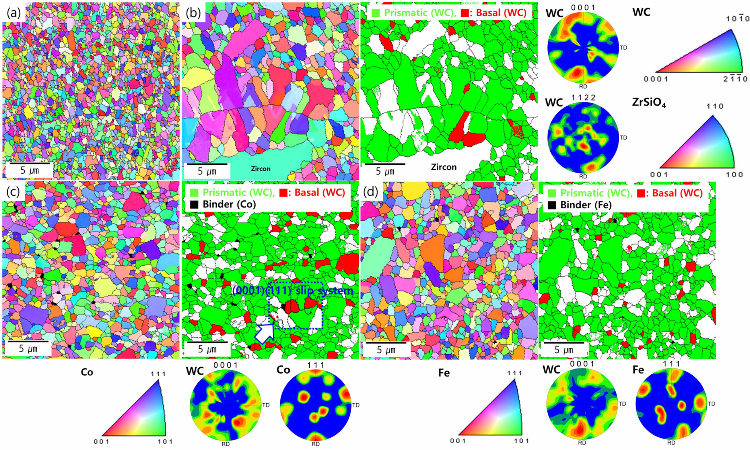 Fig. 7 shows the grain size and orientation mapping of the WC-X-Y composites observed by EBSD. In the (0001)[001] direction of the micrograph in Fig. 7(a)- (d), the variation of WC particle sizes presented are (a) 0.67 µm, (b) 1.20 µm, (c) 0.80 µm, and (d) 0.72 µm, which depend on the growth behavior of the WC grains. In Fig. 7(a), where namely solid- state sintering without binders, it might be expected to form densi- fication as a driving force for the agglomerated evolution that vanished pores between WC particles. Therefore, it is possible to suppress abnormal grain growth caused by surrounding grains by maintaining refined WC grains. However, in Fig. 7(b), the bimodal grain distri- bution of WC (i.e., abnormal & fine) is shown in the adjacent interface with zircon. Here we see that the prismatic plane is closely related to abnormal grain growth [39]. The prismatic plane has high anisotropy in stacking fault energy compared to the basal plane, where this anisotropic energy tends is to form faceted grains. Those that grew abnormally as prismatic planes (green region) are coarser than the basal planes (red region). Fig. 7(c) and (d) shows that the distribution of grains and basal planes of WC according to the binders. In particular, the WC {0001} basal plane is known to be a coherent interface plane as it is coincident with the {111} plane for FCC structures and slip systems with HCP structures [40]. In the case of the Co binder, it can be seen that their distribution was at the interface of the basal plane, so the possibility of the (0001)hcp(111)fcc slip system can be estimated. That is, the presence of this slip system may be caused in the region (see Fig. 7(c) enlarged) of the Co-binder adjacent to the basal plane of WC. This behavior is caused by inter-diffusion of Co by transgranular propagation due to its high solubility in WC grain boundaries as a binder, whereas Fe is hardly involved in the plastic deformation of WC because it has intergranular propagation [3].