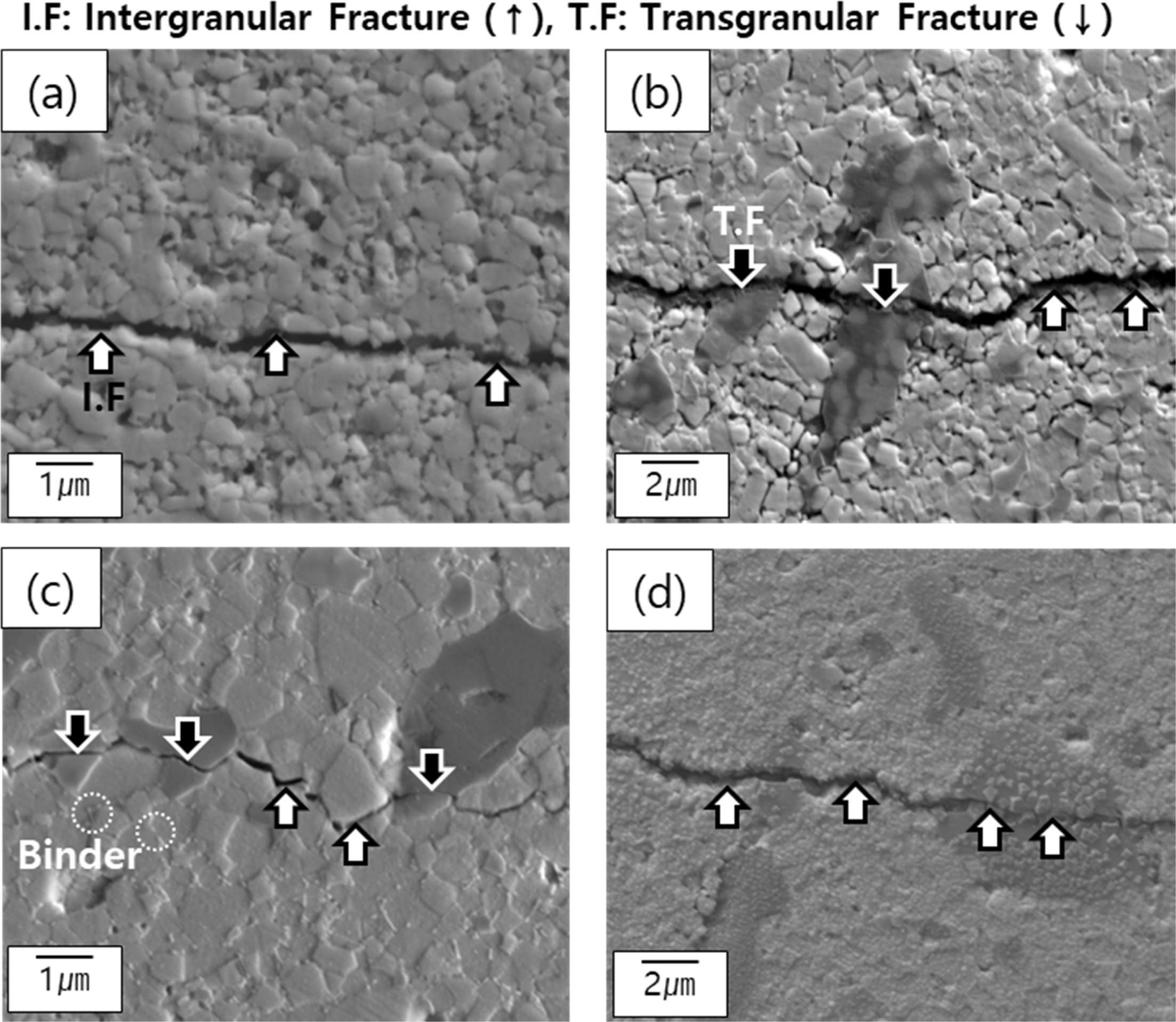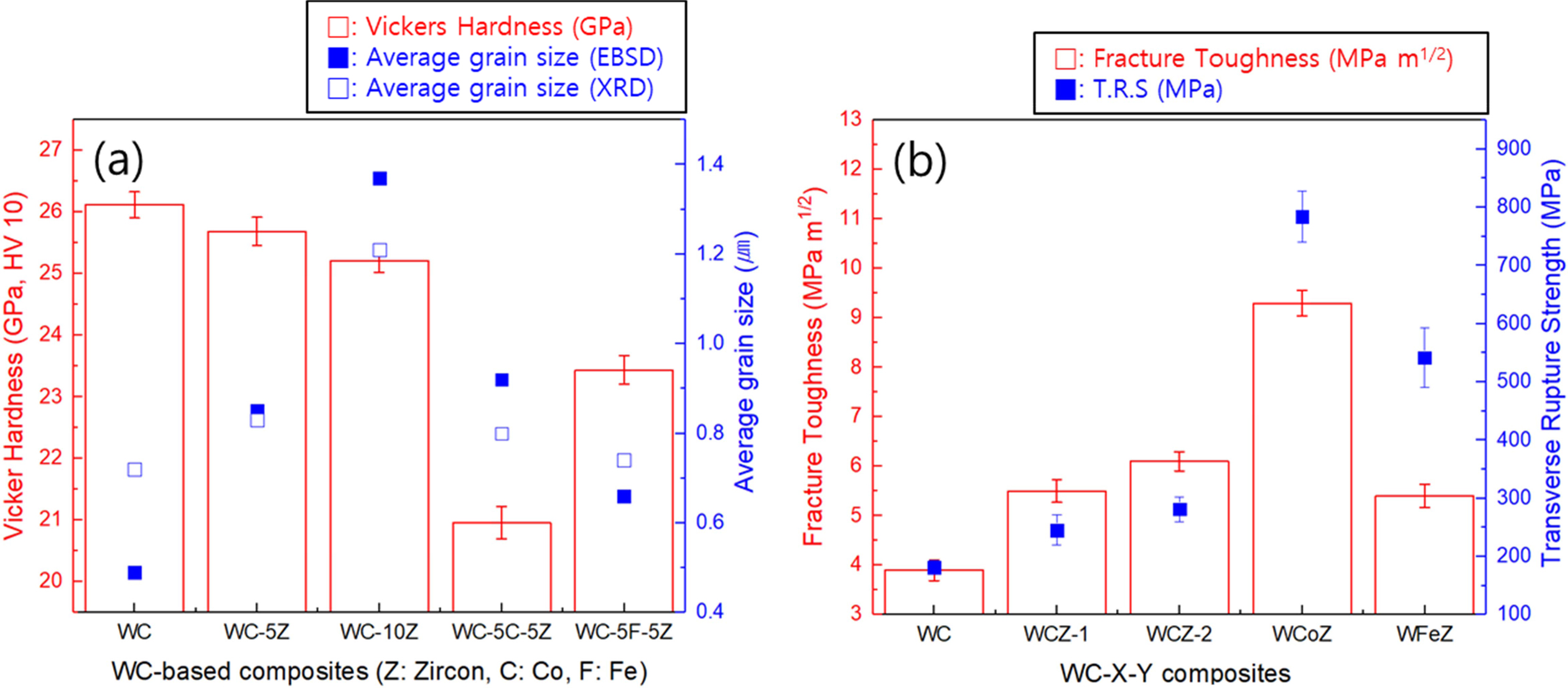 Fig. 8 and 9 show the mechanical properties and crack propagation of the WC-X-Y composites. Based on the WC grain size, measured by various methods, those with added zircon, the hardness characteristics were determined according to the grain size, as shown in Fig. 8(a). With increasing zircon contents, the hardness gradually decreases (26.11 GPa to 25.21 GPa). Additionally, the mechanical properties of those composites with added binders were also affected by the coherent interface state. In other words, it was found that the higher the intergranular diffusion from added Fe, the more grain growth of WC was suppressed (0.91 µm to 0.66 µm), and the hardness increased (20.95 GPa to 23.43 GPa) considerably.