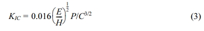 Where E is the elastic modulus (WC: 696 GPa, ZrSiO4: 255 GPa, Co: 199 GPa, Fe: 204 GPa); H is the hardness; P is the applied load; and C is the length of the crack.