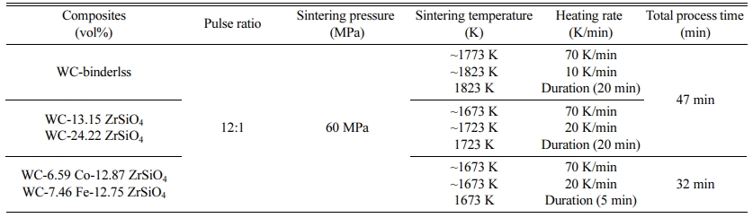 Thus, metal oxides have been used as binders to impart moderate toughness and retain the strengthened hardness required for cutting tools [22-26]. Especially, WC-ZrO2 composites show excellent wear resistance and creep strength compared to conventional cutting tools [24-26]. In addition, zircon (ZrSiO4) can be replaced with zirconia (ZrO2) to make the reinforced composites with excellent chemical inertness (cf. cobalt (Co) leaching by alkaline media [27] during the cutting process) and flexural stress properties at high temperatures after spark plasma sintering [28], which is a cheaper process considering it exploits materials abundant in nature [28-29]. However, few studies have yet reported on the consolidation behavior of WC-ZrSiO4 composites by observing the dissociation behavior of zircon [30-32] during spark plasma sintering at various temperatures. Also, a novel composite such as WC-ZrSiO4’s mechanical properties is worth investigating with a view to its use in cutting tools.