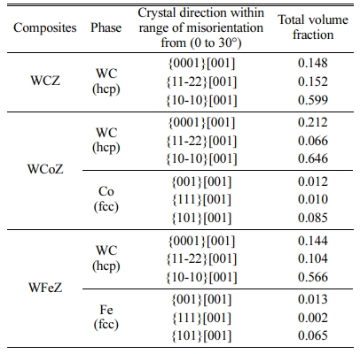 Table 2 Volume fraction of (0001) pole figure in WC-X-Y composites of the major crystal direction. |