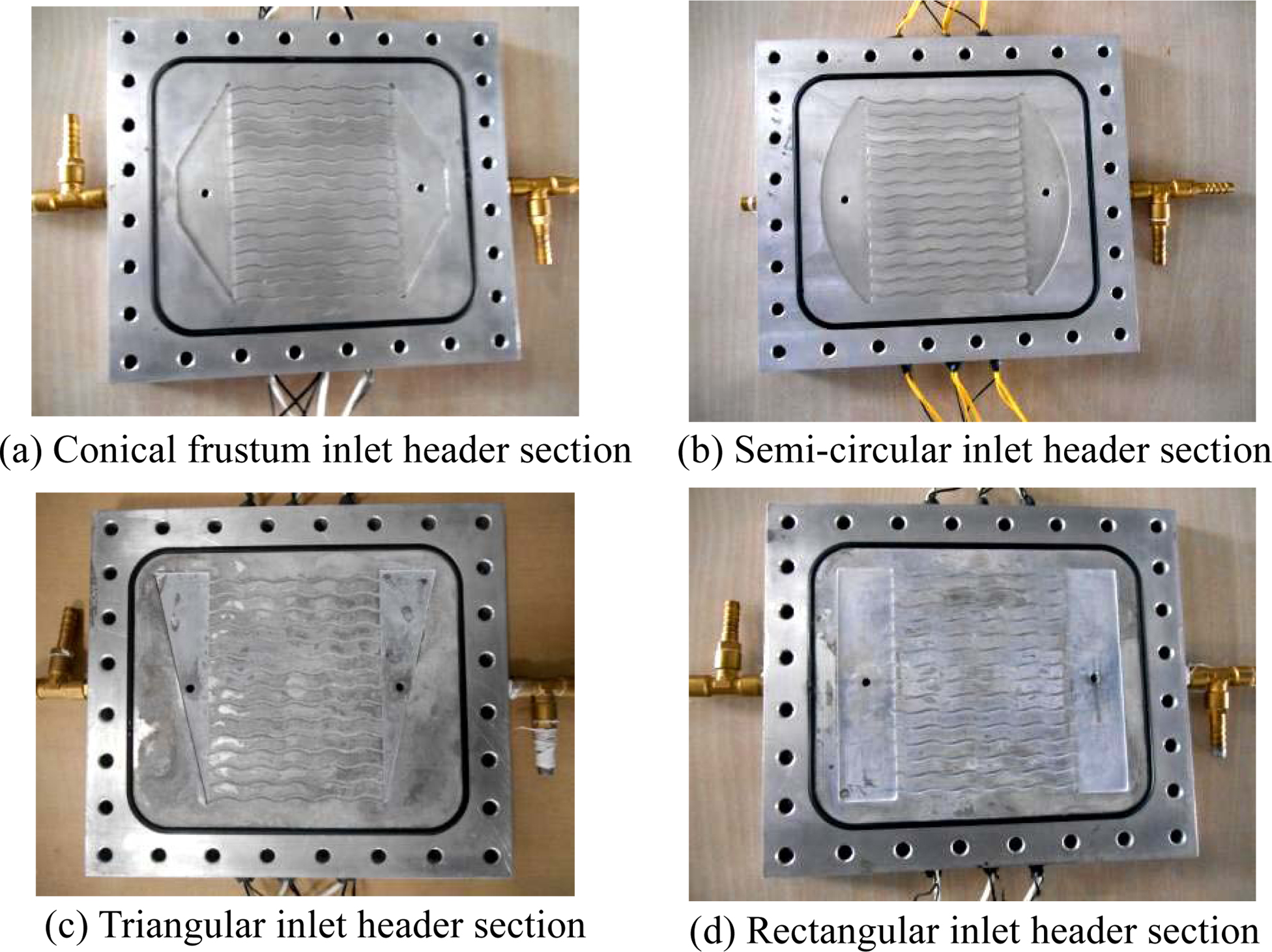 In the present work, the experimental and numerical analysis of wavy microchannels with different inlet header geometries was performed. The wavy micro- channels were fabricated with similar channel length, frontal flow area and micro channel thickness with varying inlet header geometry for the experimental analysis [11]. The geometric parameters of the wavy channel for the experimental apparatus are listed in Table 1. The wavy microchannels were designed with different inlet header geometries such as conical frustum, semi-circular, triangular and rectangular profiles and their specifications are listed in Table 2. The wavy microchannels with respective inlet header geometries are represented in Fig. 1.
