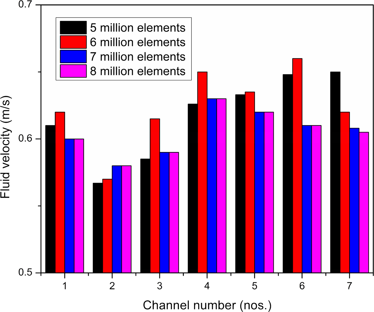 The computational domain was discretized by ANSYS ICEM CFD v18.0 meshing software. Table 5 enumerated the criteria of the mesh quality. The domain was developed with 7 million mesh count. The fluid velocity was compared with the calculated velocity when the initial mesh count was set at 5 million. The observed deviation was higher than 10% and subsequently the mesh count was set at 6 million. The observation in deviation was noted to be less than 1% for both mesh counts without major changes in observation. As a result, the mesh count selected was 7 million to evaluate the solution time. The mesh independence study is inferred in Fig. 5. Table 6 enumerated the boundary conditions of the present work. The computational domain utilized a pressure based double precision solving multiprocessor. The validated K-ε turbulence model was the turbulence of the fluid flow.