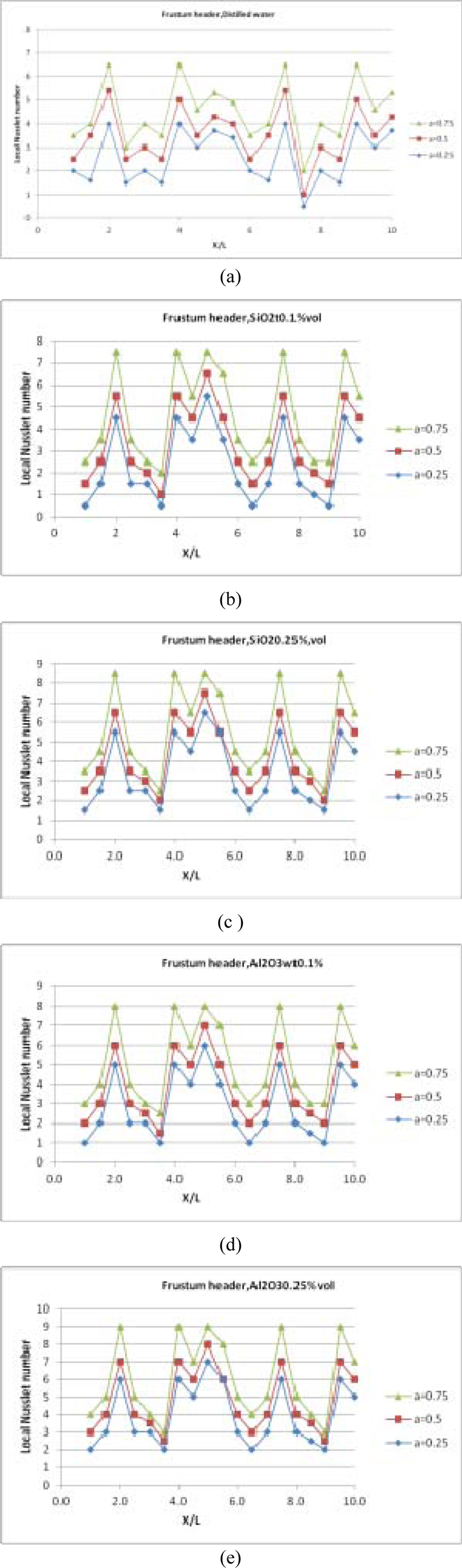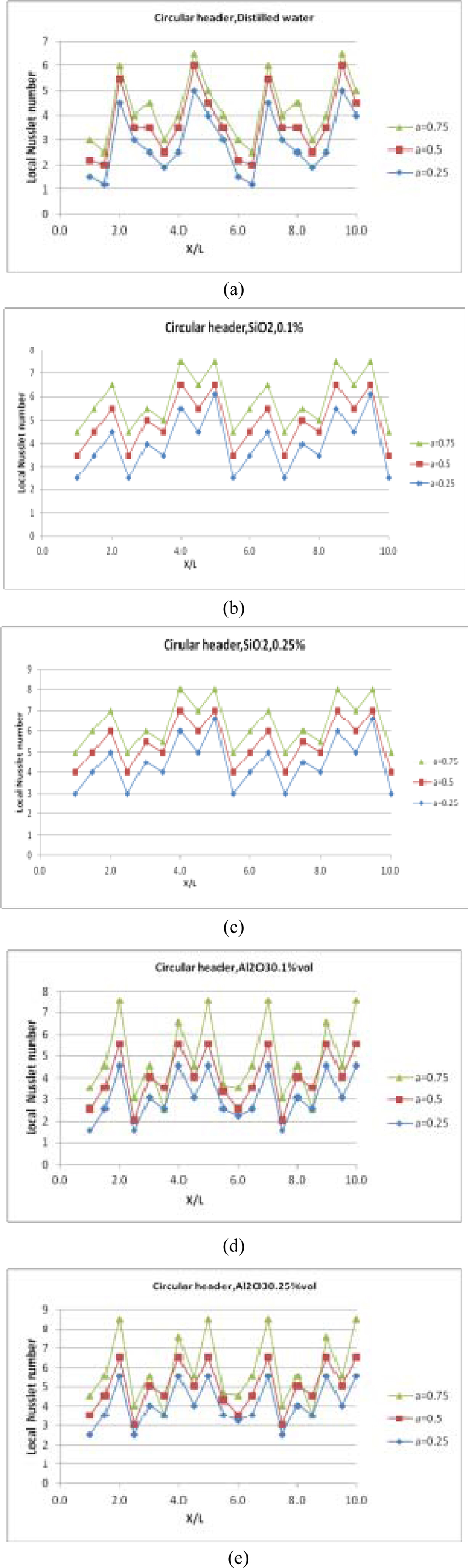 The highest local Nusselt number of 9 was observed for conical frustum inlet header, followed by semi-circular, rectangular and triangular inlet headers ex- hibiting local Nusselt numbers of the order 8.5, 7.2 and 7 respectively. It was observed that with increasing heat flux amplitude, the local maxima of Nusselt increased with corresponding decrease of local minima.