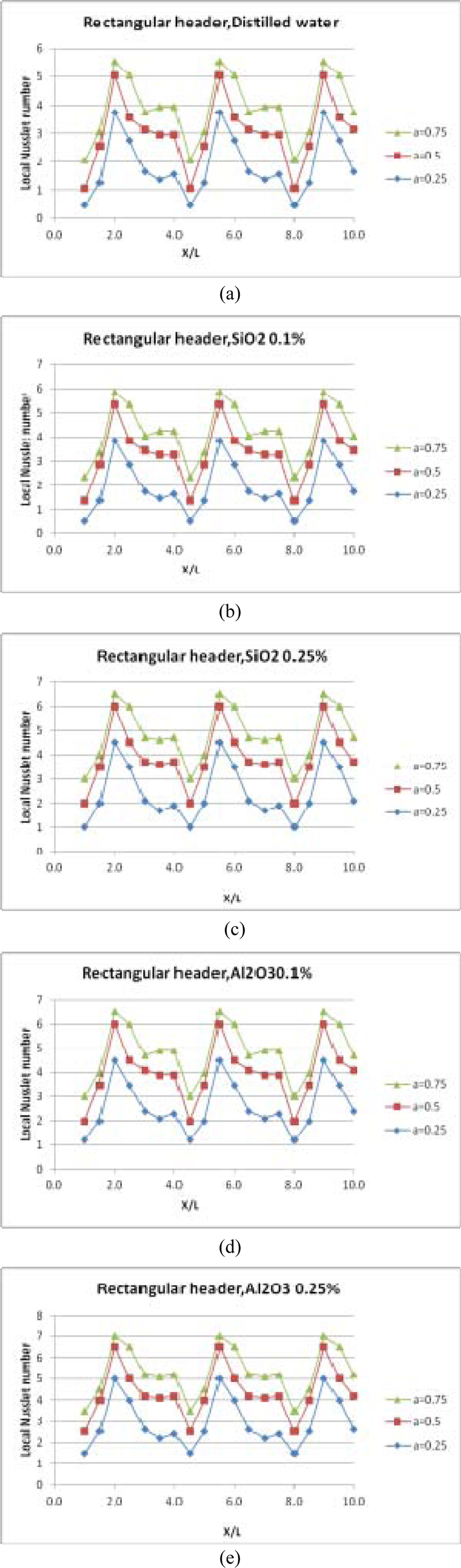 The numerical investigation for identifying the in- fluence of inlet header geometry on local Nusselt number was performed by subjecting the microchannels with different inlet headers to homogeneous heating of 40 W/cm2. The coolant temperature of the coolant fluids entering the wavy microchannels is 293.15 K under constant Reynolds number of