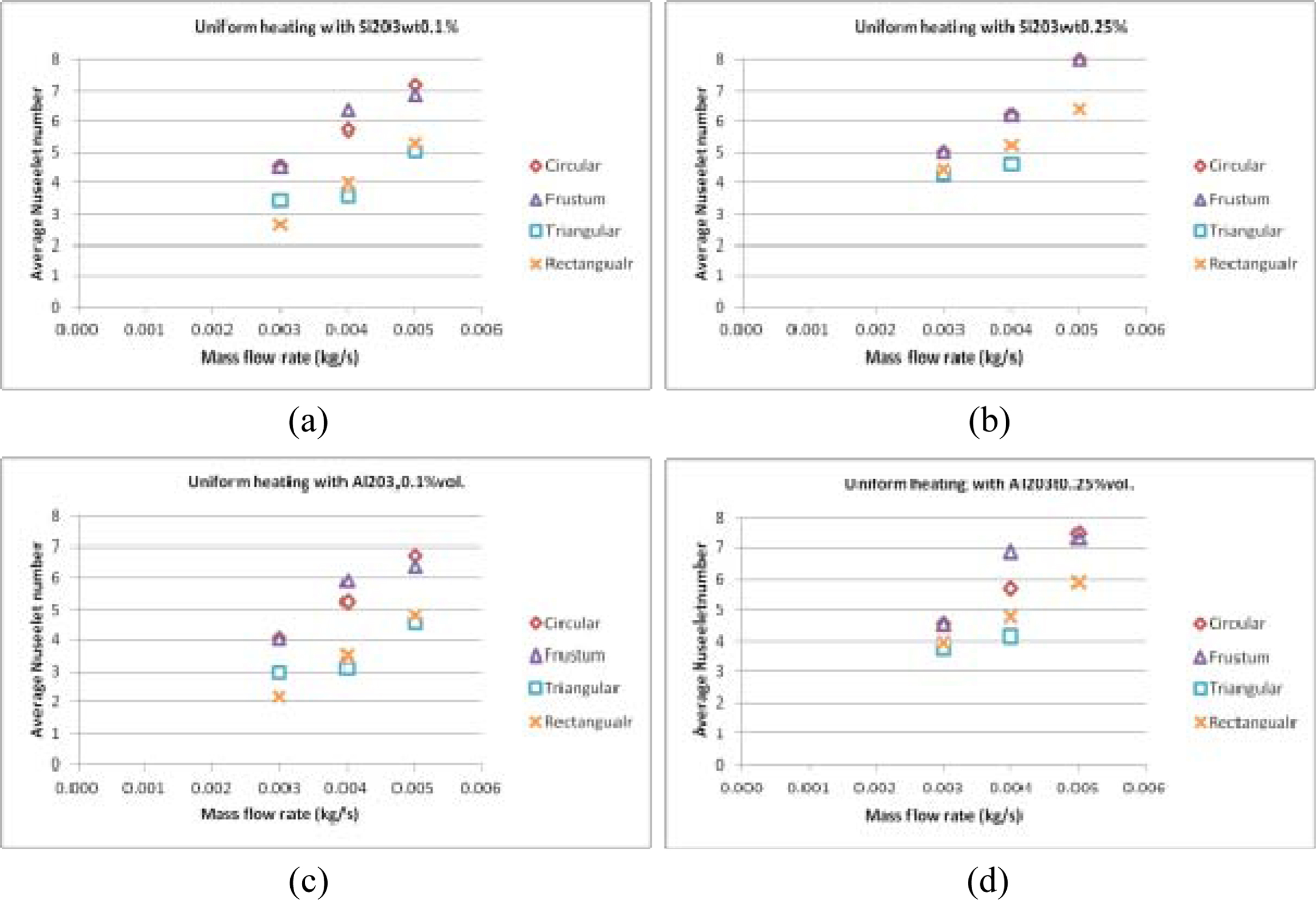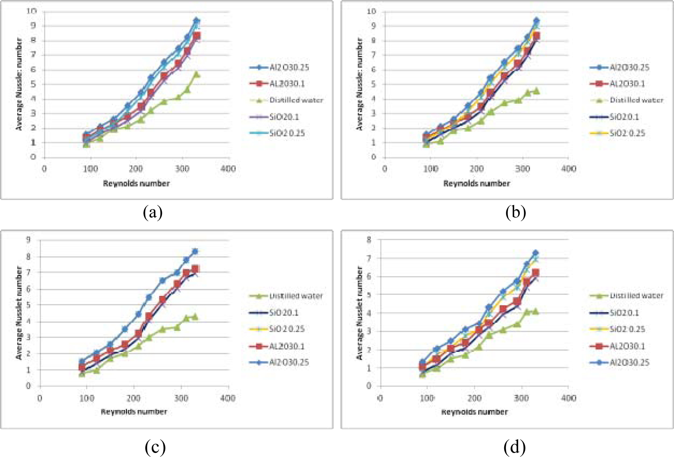 Fig. 10 Variation of average Nusselt number with respect to mass flow rate (a) SiO2, 0.1%; (b) SiO2, 0.25; (c) Al2O3, 0.1%; (d) Al2O3, 0.25% volume percentages |