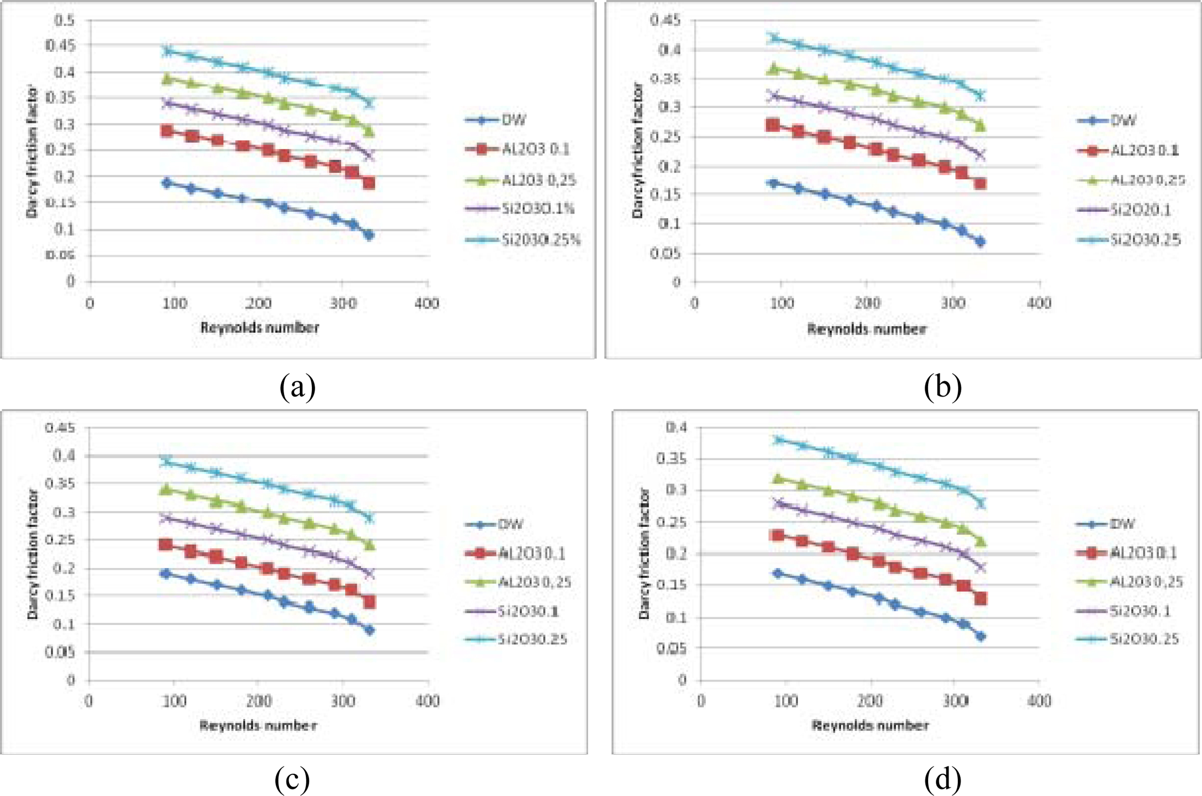 Consistent increment of nanoparticles at a rate of 0.1 volume percentage leads to increase of friction factor by 95% with Reynolds number, Re = 300 and the same was true for the nanofluid concentration of 0.25 volume percentage, with Re = 400. The peak friction factor was observed at the nanoparticles concentration of 0.25 volume percentage for the entire range of Reynolds number in the present study. This was due to decrease of average fluid flow speed caused by the addition of nanoparticles concentration at 0.25 volume percentage. The change in friction factor was dependent on viscosity and nanofluid`s thermal conductivity [23]. Similarly, the friction factor also varied as per enhanced concentration of the nanoparticles in the nanofluid at 0.1-0.25 volume percentage. The drop in pressure which influenced the friction effects of the different nanofluids in the present study was listed in Table 7.