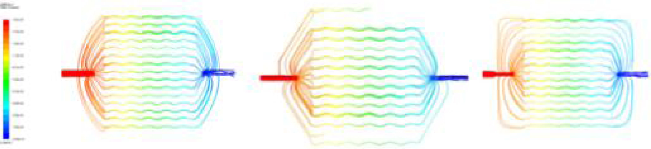 The velocity profiles of the four-inlet header wavy microchannels for when using SiO2 (Fig. 12) and Al2O3 (Fig. 13) based nanofluid were developed. The velocity profile of the wavy microchannel with triangular inlet header the heat transfer performance observed was comparatively inferior to the other three inlet header types and thus excluded from the numerical study.