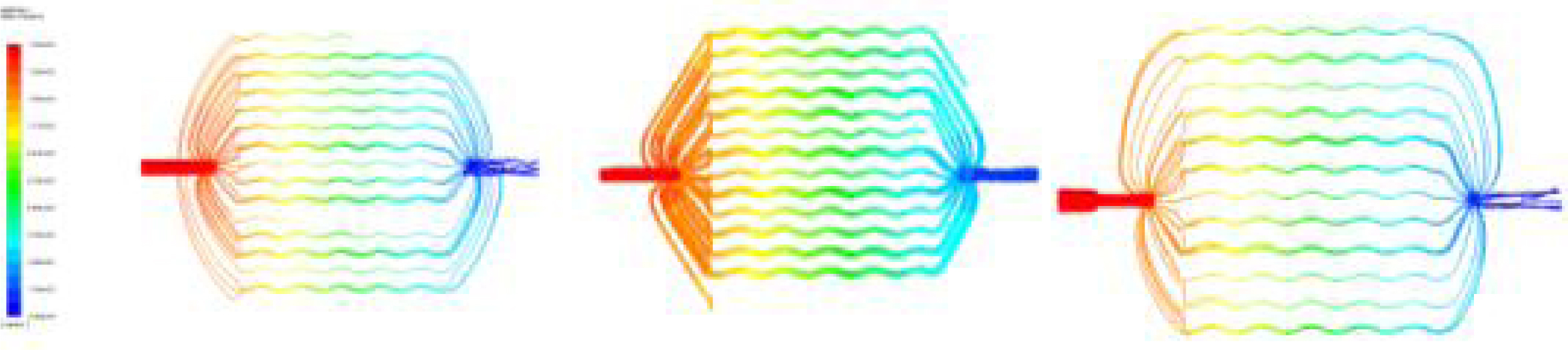 Fig. 12 Velocity profile of inlet headers (a) semi-circular (b) conical frustum (c) rectangular geometry while using Al2O3. |