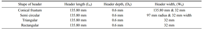 As for the dimensions of the different inlet headers, the header lengths for conical frustum, semi-circular, triangular and rectangular inlet header geometries were 135.80 mm. The header depths of all the inlet geometries were also the same at 0.6 mm. The conical frustum header had a design radius of 135.80 mm and 32 mm of header width; with semi-circular inlet header had a 97 mm diameter and 32 mm width. The triangular and rectangular inlet headers both had a header width of 32 mm.