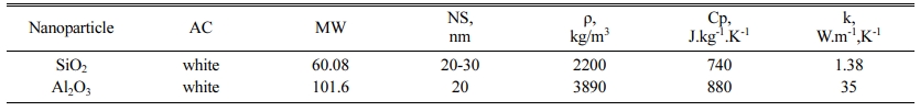 The nanofluids in the investigation were produced by dispersing Silicon dioxide (SiO2) and Aluminum trioxide (Al2O3) nanoparticles in anatase crystal phase. The purity level being 99%, the average diameter was 15 nm with specific surface area of 356 m2/g. Double distilled water was used as the base fluid. The present study includes four types of nanofluids that were prepared for investigation. De-ionized water served as base fluid with liquid medium [14, 15]. Silicon dioxide and aluminum trioxide were used as additives, their physical properties listed in Table 3.