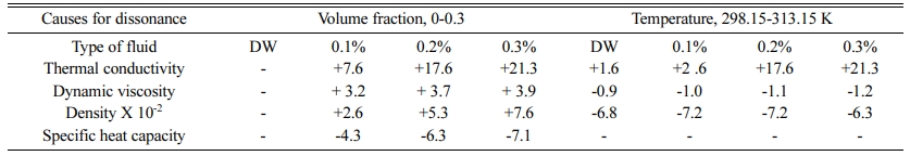Table 4 Average variations of measured properties with volume fraction and temperature (%). |