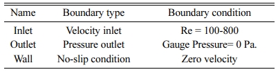 For simulations involving fluid flow, constant fluid inlet and outlet pressure were the boundary conditions. For simulation involving thermal conditions, constant fluid inlet temperature was assumed to be the condition for the boundary limit due to the walls being assumed as insulators [20]. The source for heat was assumed to be in the center of the channel in the direction of the flow to the other side of the wavy surface [21].