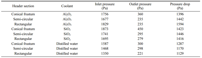 The highest Nusselt number exhibited was in the range of 4.5-7 and 5-8 for lower and higher mass flow rates respectively in case of conical frustum inlet header. The semi-circular header exhibited similar performance with triangular and rectangular headers exhibiting Nusselt number in the ranges of 2.8-5.2 and 4-6.2 respectively. The highest heat transfer rate for the coolant fluids was exhibited by Al2O3 followed by SiO2 and distilled water.