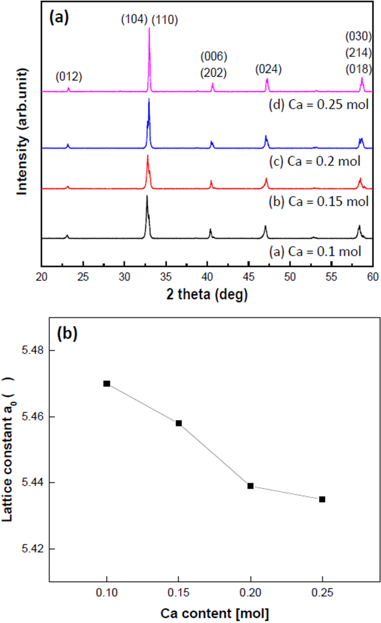 Fig. 2 (a) X-ray diffraction patterns and (b) Lattice constant of Cadoped LSMO specimens |