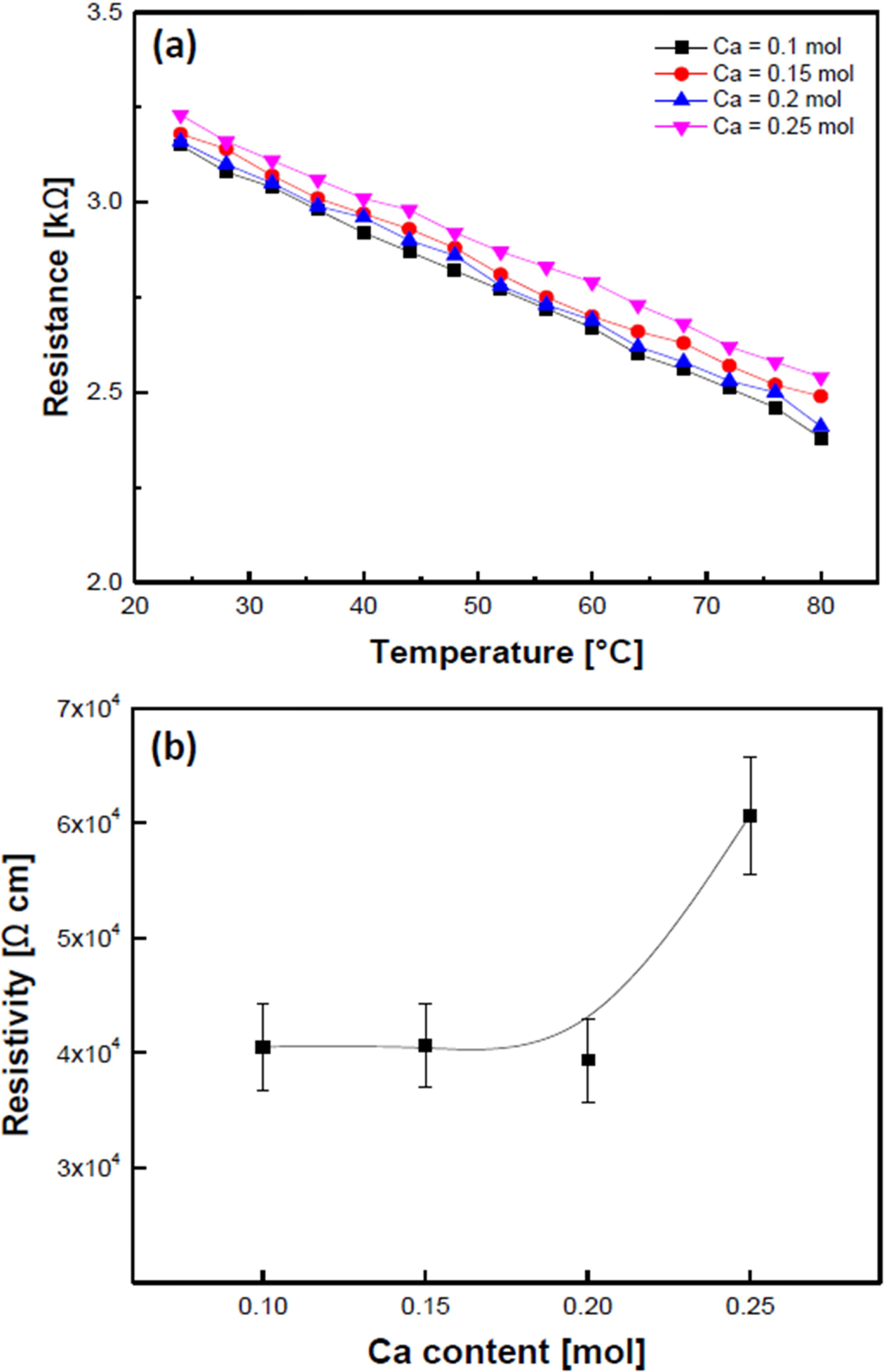 Fig. 5 shows the resistance-temperature (a) and the resistivity at room temperature (b) of the Ca-doped LSMO specimens. All specimens exhibited typical negative temperature coefficient (NTCR) properties in which resistance decreased linearly as temperature increased. All specimens exhibited good negative temperature coefficient of resistance (NTCR) properties of approxi- mately 0.445-0.421 %/oC, and the specimen doped with Ca=0.10 mol showed a maximum value of 0.445 %/oC. For the Ca composition ratio of 0.1 ≤ x ≤ 0.2, the resistivity was approximately 4 ´ 104 Ω-cm, regardless of the amount of Ca added, but for the specimen with 0.25 mol Ca added, it increased to 6.07 ´ 104 Ω-cm. In general, the electrical conductivity of manganite crystals depends heavily on their structural properties including pore distribution, secondary phases, and Mn3+/Mn4+ ion ratios. Furthermore, replacing ions with those with a smaller ionic radius in the A-site of ABO3 perovskite manganite materials reduced the electrical resistance by increasing hopping conduction. This is due to a decrease in the distance between Mn-O ions as a result of the Jahn-Teller lattice distortion of the unit cells [10]. However, in this study, the resistivity increased with an increase in Ca contents because the decrease in grain size and an increase in pore distribution [11], as shown in Fig. 2.