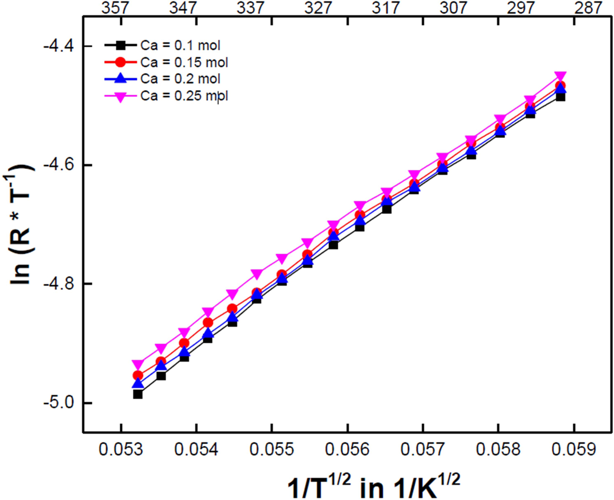 Fig. 6 ln(R*T-1) vs. 1/T1/2 curves of the Ca-doped LSMO specimens. |