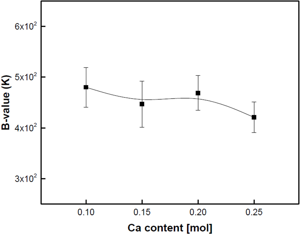 Fig. 7 shows the B25/65 value of the Ca-doped LSMO specimens. The B25/65 value was calculated from the following equation: B25/65=(lnρ1-lnρ2)/(1/T1-1/T2), where ρ1 and ρ2 are the resistances measured at temperature Ti (25 oC) and T2 (65 oC), respectively. The B value of the NTC thermistors represents the sensitivity of the change in electrical resistance in relation to the change in temperature. As the Ca composition ratio increased, the B values decreased slightly. The specimen doped with 0.1 mol Ca showed the highest value of 480 K. In general, the smaller the distance between Mn-O ions and the smaller the angle between Mn-O-Mn ions by Jahn-Teller lattice distortion, the higher the conductivity due to the increased probability of hopping to adjacent sites. However, in the Ca-doped LSMO specimens, structural properties such as grains, grain boundaries, and pores played a dominant role in the B25/65 value than the conduction mechanism controlled by impurities, as shown in Fig. 5. It is possible to obtain excellent electrical properties if uniform and dense specimens can be produced through changes in manufacturing process conditions.