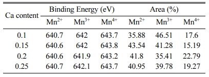 Fig. 4 and Table 1 show the Mn 2p spectra and the orbital binding energies and areas of XPS analysis in Ca-doped LSMO specimens, respectively. The Mn 2p band spectrum is greater than the FWHM of the single valence state [8], which is strong evidence that there is overlap of Mn2+, Mn3+ and Mn4+ ions [9]. The Mn2+, Mn3+ and Mn4+ ion peaks corresponded with binding energy levels of 640.6-640.7 eV, 641.9-642.1 eV, and 643.2-643.8 eV, respectively. The shape of the Mn 2p signal of the Ca-doped LSMO specimens implies that the majority of the Mn ions are in the Mn2+ and Mn3+ states. The Ca composition ratio did not affect the binding energies of the Mn ions and Mn3+/Mn4+ ratios.