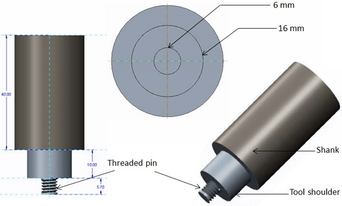 The present work involved friction stir welding of aluminium AA5083 alloy plates with 6mm thickness. The composition of the specimen plates and their properties are stated in Tables 1 and 2 respectively. The AA5083 alloy plates with the dimensions of 120 mm x 100 mm x 6mm friction stir welded by a modified vertical milling machine. The butt-joints formed by the friction stir welded as per the L9 orthogonal array experimental methodology. The input parameters that were varied over the course of the experiment were friction stir tool rotational speed (rpm), stir tool welded speed (mm/minute) and tool tilt angle (degree). The friction stir welding tool was made from H13 grade steel with 5.7 mm pin length, 6 mm pin diameter, 16 mm tool diameter and a 40 mm shank (Fig. 1). The position of the tool pin was placed in the midst of the joint region during welding process and the tool was rotated in the clockwise direction.