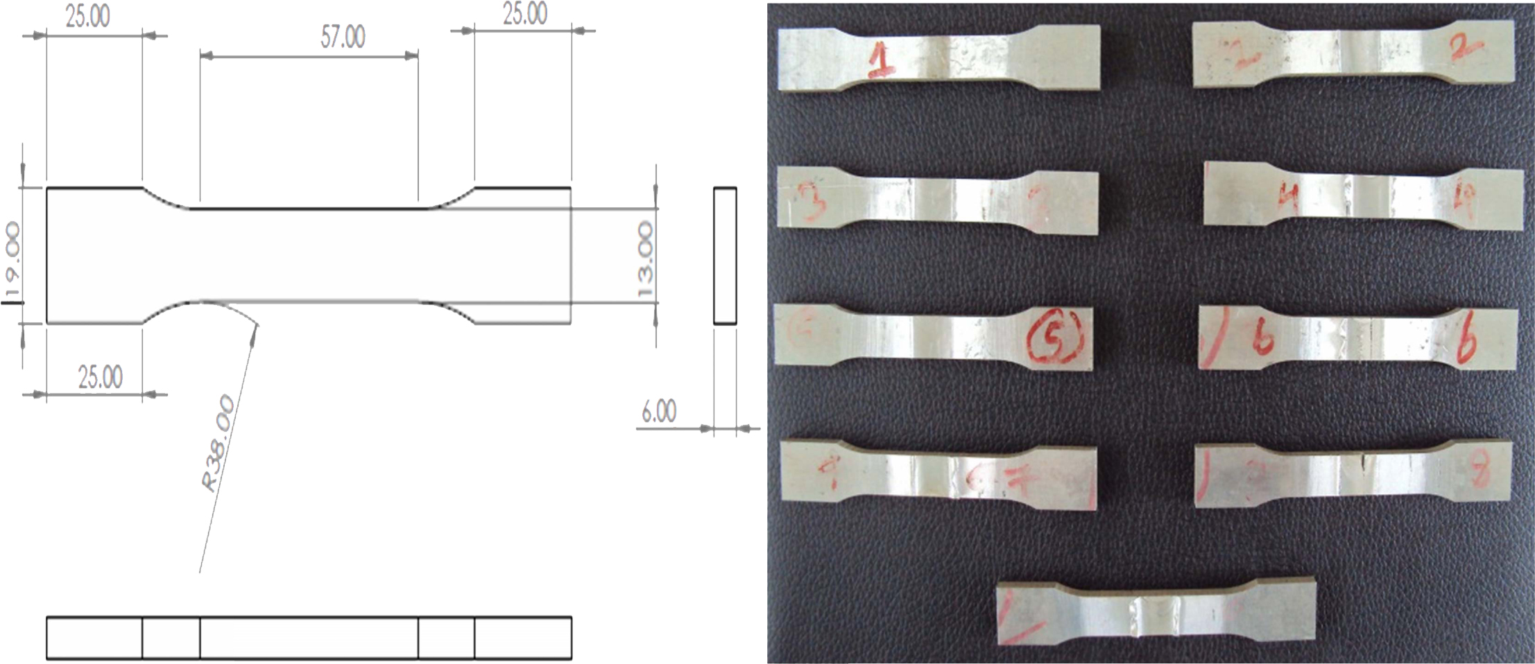 The tensile test samples were wire-cut electrical discharge machined with adherence to ASTM E8 M-04 standard to obtain dimensionally smooth specimens. The specimens were tested by universal testing machine to determine the tensile performance of the specimens at standard testing conditions. The tensile test samples and their dimensions are illustrated in Fig. 2. The microhardness survey was conducted on the various weld zones by Vickers hardness testing machine. The testing samples were prepared as per ASTM E384 standard and the testing load was applied in steps of 0.5 kgf for 10 s time limits. The fastened welded samples were subsequently ground and polished by abrasive paper. The specimens were treated with Keller`s reagent for 25 s and optical microscope (Nikon DIC) was used to analyze the microstructural variations and possible occurrences of flaws by Clemex image analysis. The welded samples were then subjected to SEM and EDAX analysis.