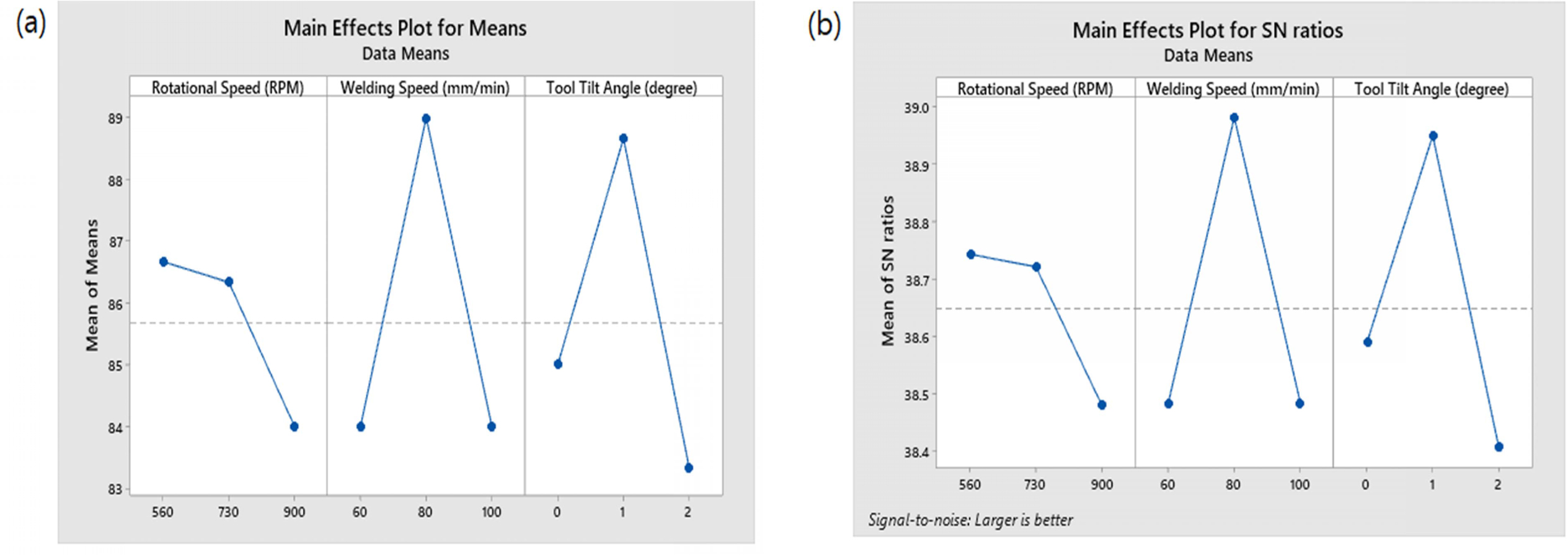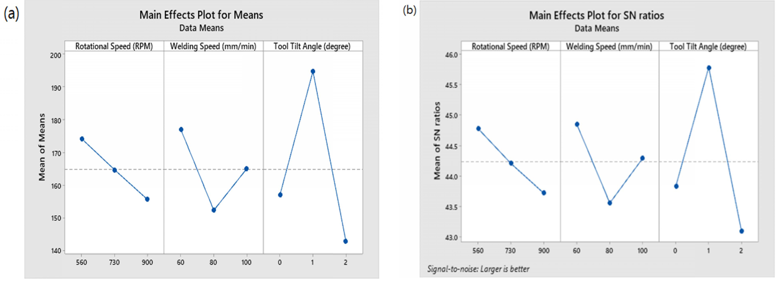 Analysis of Variance (ANOVA) is a collecti7on stati- stical models used to assert the significance of the experimental results. In the present work, it was used to determine the significance of the influencing input FSW process parameters and determine the highest influencing parameter. The ANOVA for the mean tensile strength and microhardness levels are listed in Tables 8 and 9 respectively. The main effect plots for the mean value and S/N ratio for the input parameters were illustrated in Figs. 3 and 4. The input parameter with the peak F-value in Tables 8 and 9 was observed to be tool tilt angle for both tensile strength and microhardness of the FSW joint.