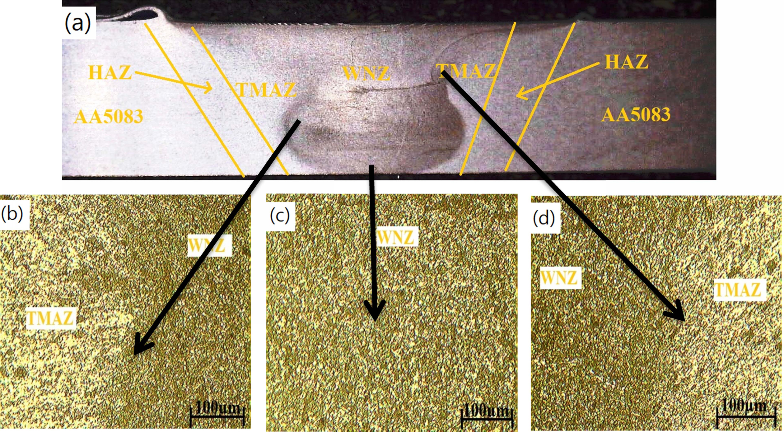• The Microhardness survey was conducted succe- fully and higher hardness value was oberved in the WNZ; lower microhardness was observed in the TMAZ, compared to base metal of AA5083 and WNZ.