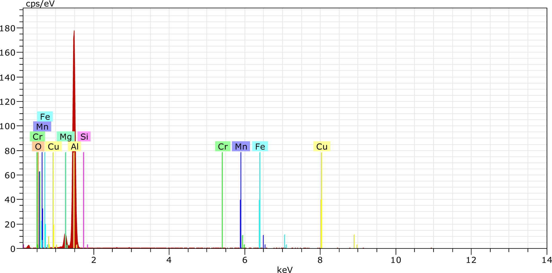 The chemical composition of friction stir welded WNZ shown in Fig. 8. The varieties of particles were characterized by energy dispersive spectroscopy. The AA5083 is rich in Mg and Fe or a multifaceted phase, rich in Mg, Si, and O2. These were observed in the optimized WNZ zone. The other variants were observed as well such as Si and O2 rich particles [21]. The minor particles were difficult to analyze, mainly they are rich in Mg and Si.