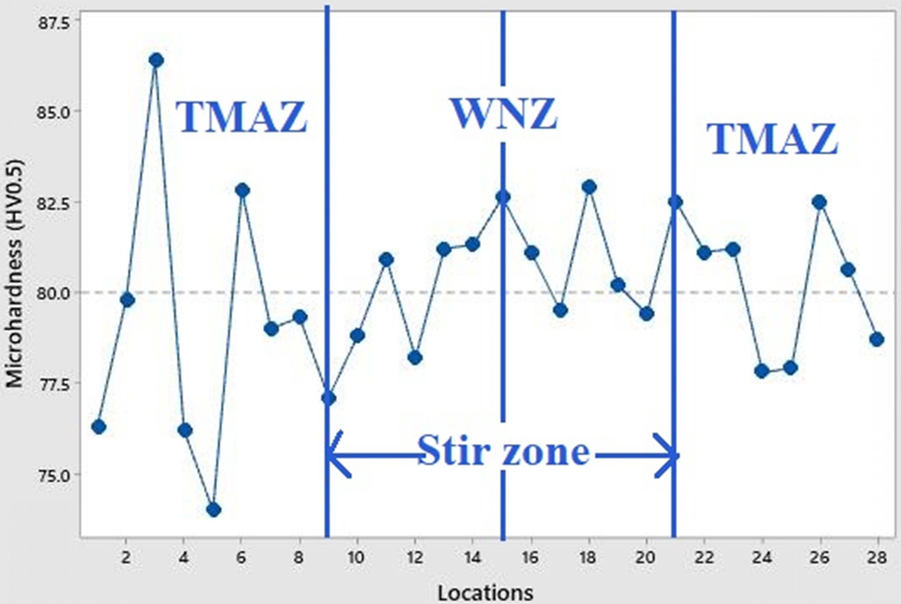 The optimized FSW AA5083 joint was surveyed in various zones to determine the Vickers microhardness levels. The results of the microhardness survey illustrated in Fig. 9 show the microhardness profile of the parallel joint friction stir welded at tool rotational speed = 560 rpm, welding speed = 80 mm/minute and tool tilt angle = 1o. The dotted vertical lines indicate the lowest microhardness values observed at TMAZ. The unaffected base metal matrix exhibited 93 HV0.5 which indicated that it was tougher and this trend declined when moving towards the weld region. The TMAZ possessed 74 HV0.5 which was the lowest microhardness value in comparison to the base metal and WNZ [22]. The microhardness level of 83 HV0.5 observed in TMAZ was the highest possible microhardness that it could exhibit.