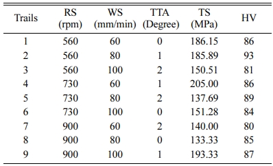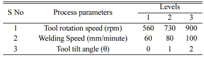 The Taguchi method technique was utilized to optimize the welding process for FSW AA5083 grade aluminium joint. A suitable orthogonal array (L9) was be chosen liable on the total degree of freedom (DOF), which can be calculated by summation of specific degree of freedom for each FSW parameters. The levels of the individual FSW parameters were selected by means of preceding literatures (Table 3). Subsequently, the array with 8 different degrees of freedom was designated to estimate the properties of the welding parameters based on tensile and micro hardness of AA5083 alloy.