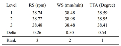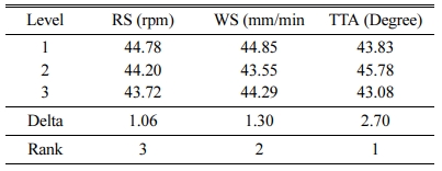 The tensile strength and microhardness of the 9 sample specimen FSW joints after the mechanical testing were listed in Table 4. The mean value and S/N ratio for both tensile strength and microhardness were presented in Table 5. As can be observed from the Tables 4 and 5, the optimal weld input parameter values to obtain peak values for both tensile strength and micro- hardness at varying input parameter levels. Tables 6 and 7 presented the response values for the S/N ratios for both tensile strength and microhardness respectively. The response values also varying among them for each combination of the three input parameters (tool rotational speed, welding specimen and tool tilt angle) as part of the experimental methodology. The higher S/N ratio typically result in enhanced joint characteristics [18, 19]. The R1S1T2 was observed to be the optimal input parameter setting for obtaining peak tensile strength as observed form Table 6. Thus, based on all the experi- mental inference the R1S2T2 was observed to be the optimal input parameter setting for microhardness in Table 7.