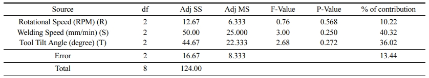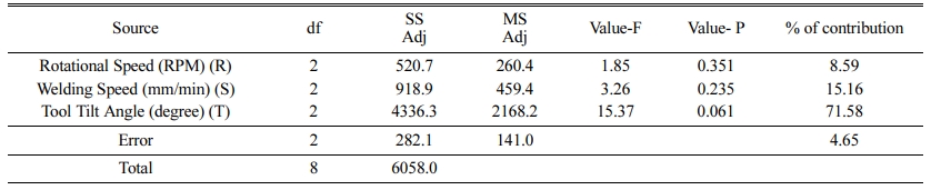 • The tool tilt angle was found to be the most influencing input parameter among the input process parameters followed by welding speed. Tool tilt angle had a weld influencing significance of 71.58 %.
