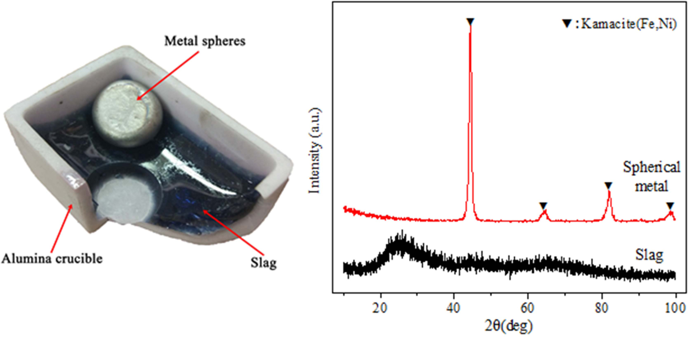 Fig. 1 The slag, metal sphere and their X-ray diffraction patterns. |