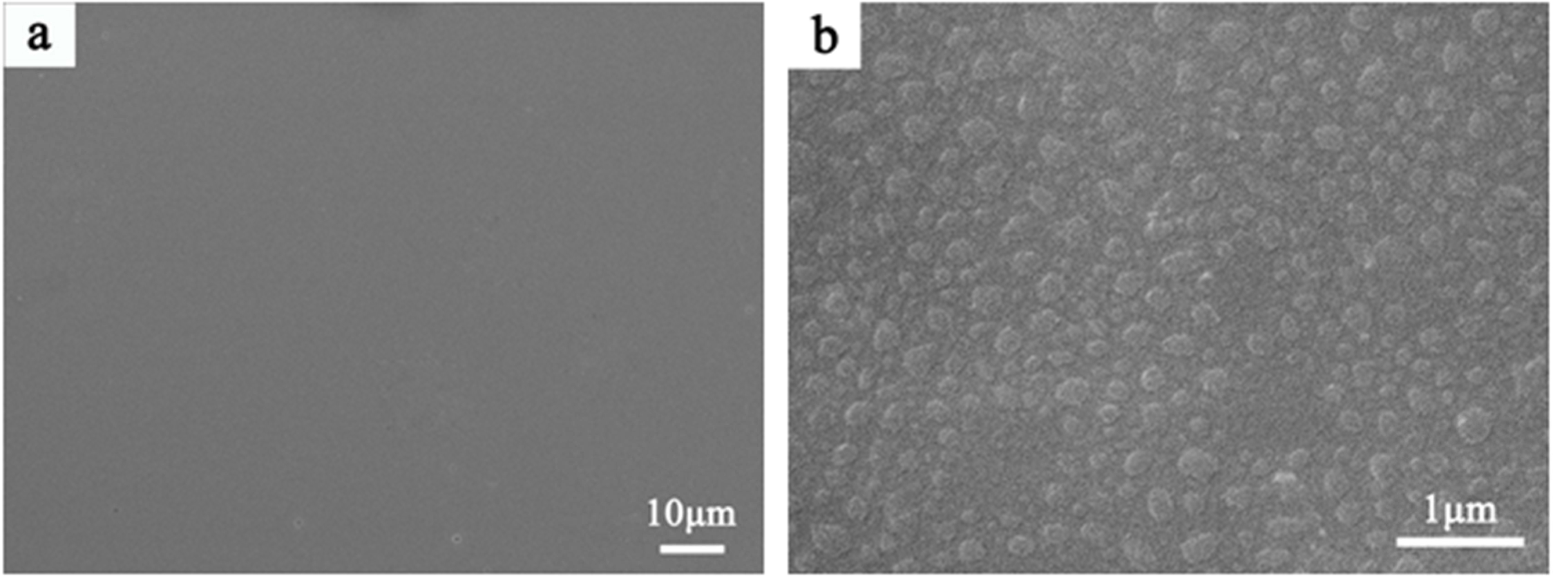 Fig. 2 SEM images of the slag glass, a: ×2000; b: ×20000. |