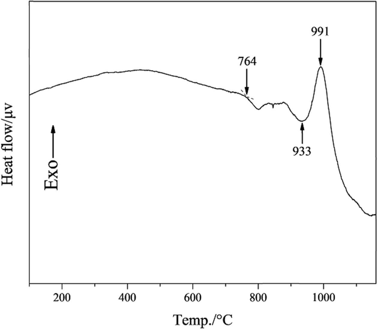 Fig. 4 shows the DSC curve of the slag glass. The slag glass transition temperature is 764 oC, the transition of atoms in slag glass and the adjustment of glass network structure at this temperature. the onset crystallization temperature and the crystallization peak temperature are 933 o and 991 o.
