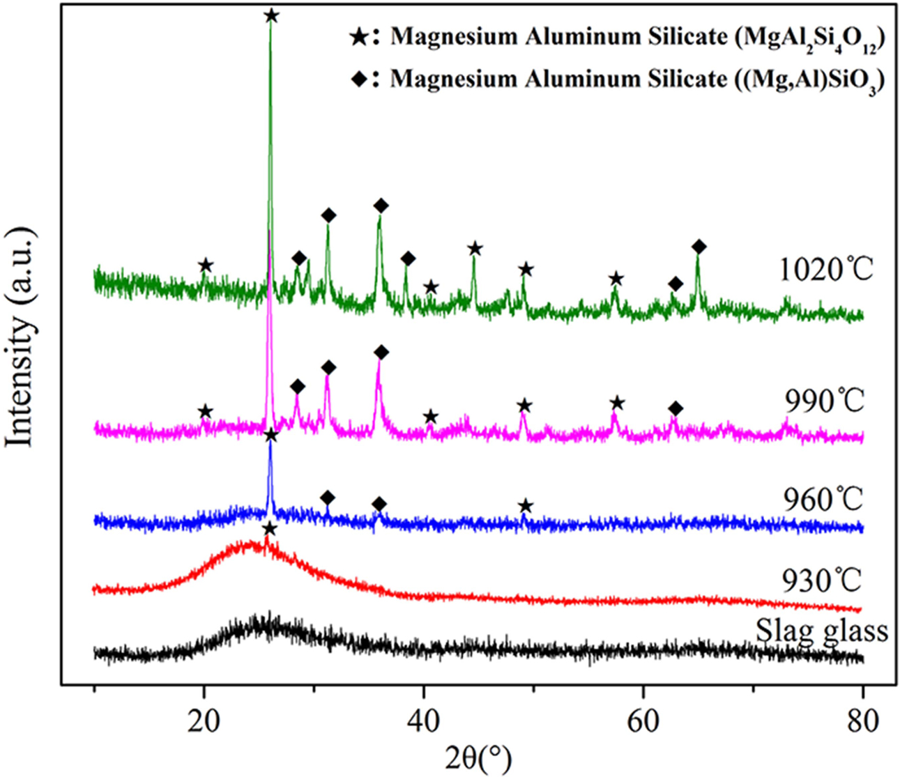There is significant droplet phase separation in the slag glass, which will induce the crystal to precipitate during the subsequent heat treatment. With the tem- perature or time increases, the crystallinity of the sample is increasing, and the type of the crystal phase does not change, that is, two different structures of magnesium aluminium silicates: MgAl2Si4O12 and (Mg,Al)SiO3.