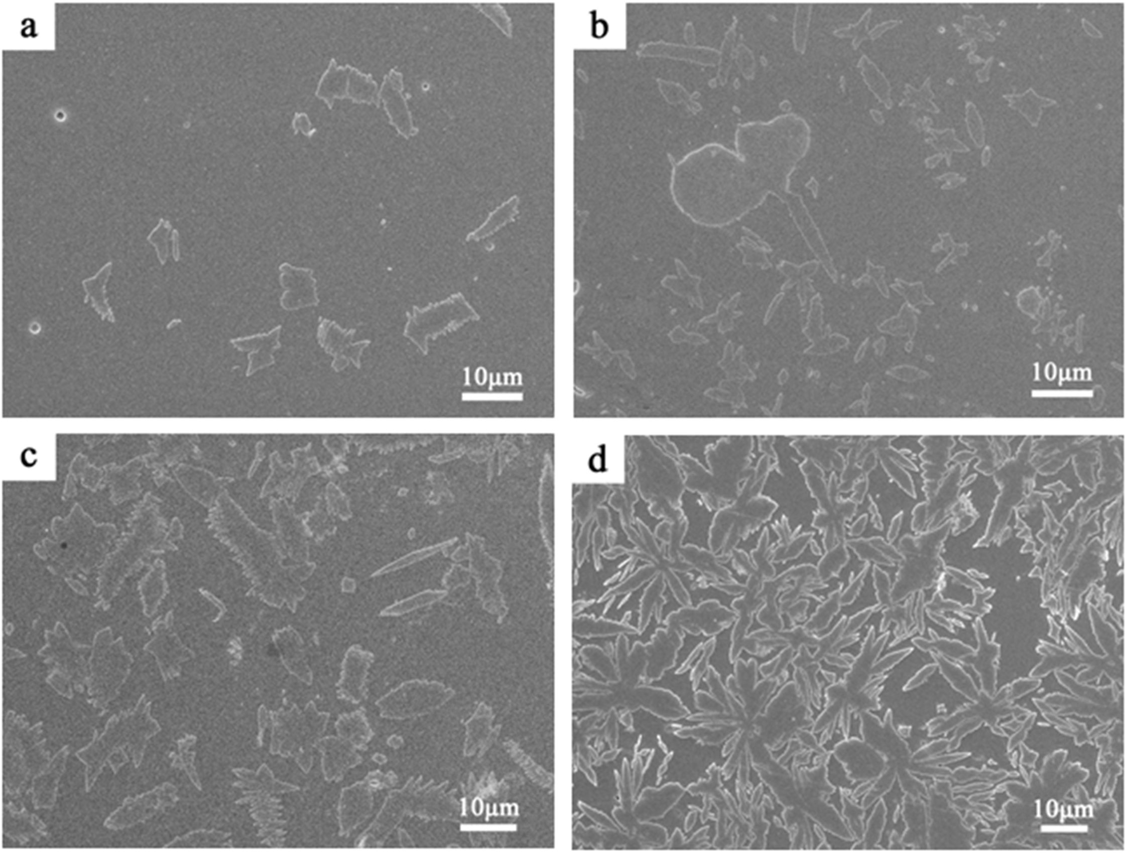 Fig. 5 shows the SEM micrographs of the samples heat treated at different temperatures for 1 h. When the heat treatment temperature is 930 or 960 oC, the number of crystals is smaller and the crystallinity of the sample is lower. Some spherical pores of about 1.5 μm appeared in the samples. This may be due to that some of the grains are washed out by ultrasonic during the ultrasonic cleaning of the polished sample after etching in the HF solution. With the heat treatment temperature increase to 990 oC, the number and size of the crystals in the sample significantly changed. At this temperature, the viscosity of the glass is greatly reduced, and the ion diffusion rate is increased. The nucleation rate and growth rate of the crystals increase, resulting in a larger number and volume of crystals. When the heat treatment temperature was 1020 oC (Fig. 5d), the secondary growth of dendrites in the snowflake or platelet-like crystals appeared, and the length of the secondary dendrites was mainly in the range of 5-20 μm.