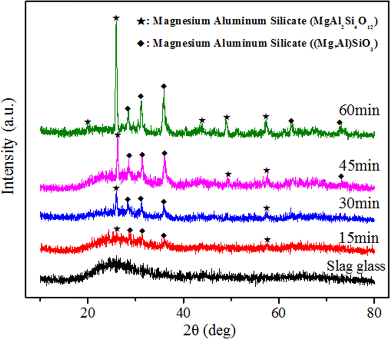 To further explore the effect of heat treatment time on the crystallization process of glass-ceramics, the slag glass was heat-treated at 990 oC for 15, 30, 45 and 60 min.