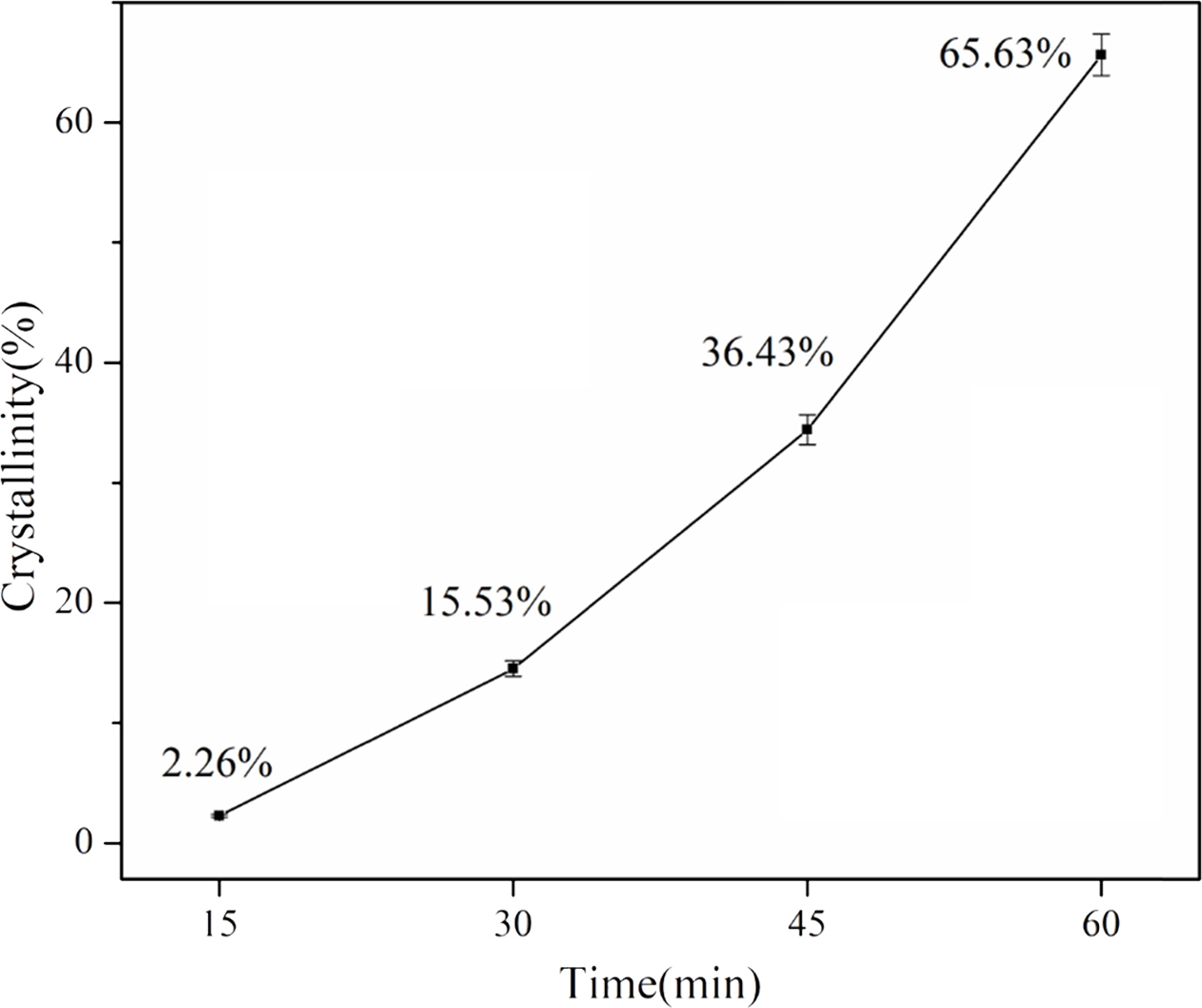 Fig. 9 reveals the crystallinity of the different samples. The crystallinity increased from 2.26% to 65.63% when the heat treatment time increased. The average crystallization rate also increased as the heat treatment time increased from 15 to 60 min. This may be due to the fact that when the heat treatment temperature is in the crystallization temperature range, the viscosity of the samples decreases over time, and the ion diffusion rate increases. Therefore, when the duration of heat treatment increases from 15 to 60 min, the crystallization rate will increase gradually.