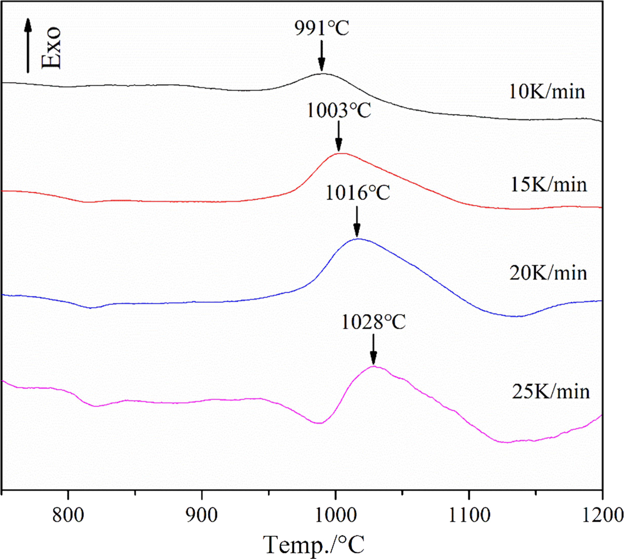 Fig. 10 DSC curves of the slag glass recorded at different heating rates |