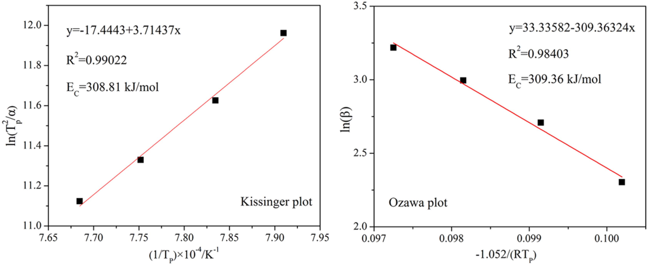 Fig. 11 Kissinger and Ozawa plots constructed from the DSC data. |