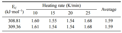 where ΔT is the width of the crystallization peak at half height. Different Avrami parameters (n) corresponded to different dimensionality of crystal growth. The value of n close to 1, 2, 3, or 4 shows that the crystallization is dominated by the surface crystallization, one-dimensional, two-dimensional, and three-dimensional growth crystallization mechanisms. The EC obtained by the Kissinger and Ozawa methods is used to calculate the Avrami parameter (n). The results are shown in Table 2.