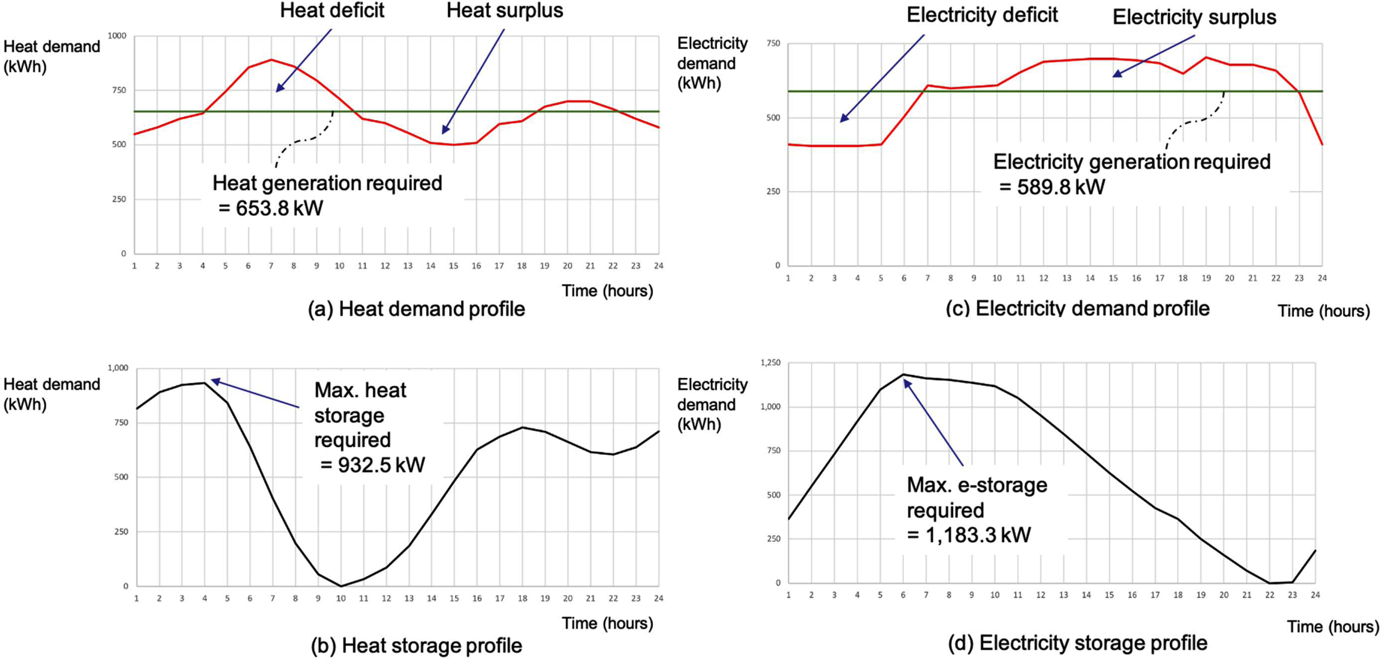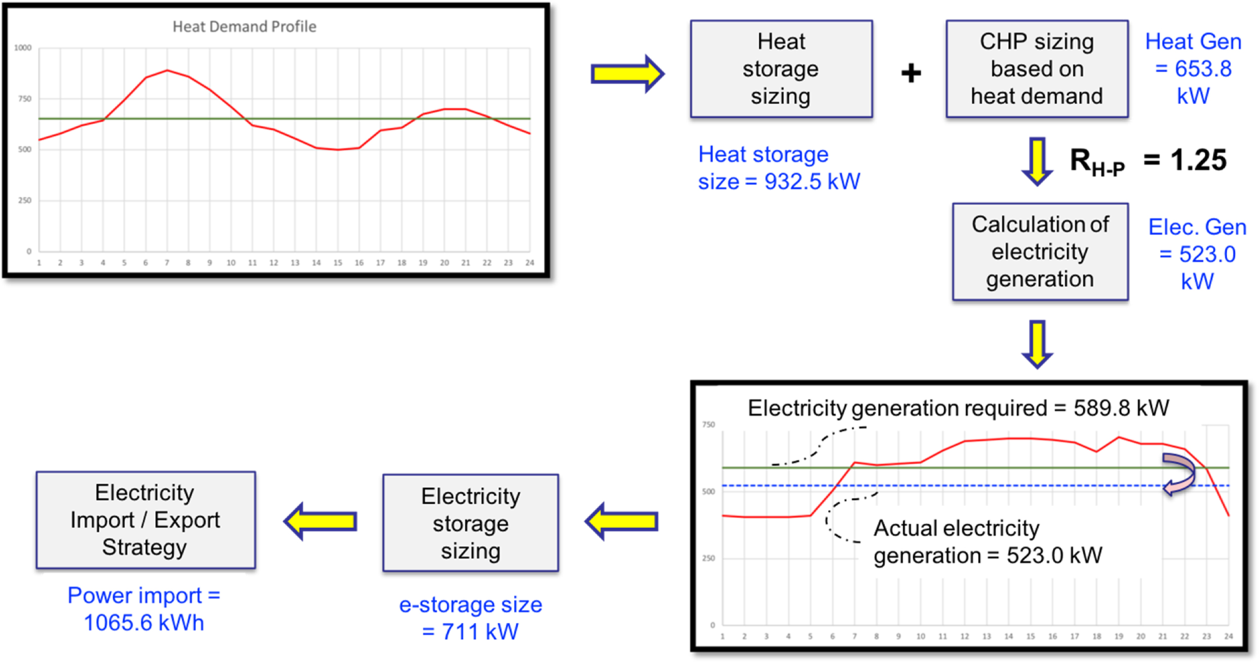 The procedure explained in Fig. 3 is now illustrated with the example discussed in this section. The heat demand profile given Fig. 1(a) is used for targeting the heat generation capacity for the CHP unit. As explained earlier, the minimum capacity to satisfy the heat demand without any external heating source is 653.8 kW, in which the maximum capacity required for heat storage is 932.5 kW. The illustrative value of RH-P is taken as 1.25, which is used to determine the capacity of electricity generation to be 523.0 kW. As the capacity specified (i.e. 523.0 kW) is less than the capacity targeted (i.e. 589.8 kW), the electricity generation from the CHP unit is not enough and the power import is necessary. The step-by-step calculations are schematically explained in Fig. 4.